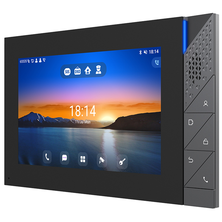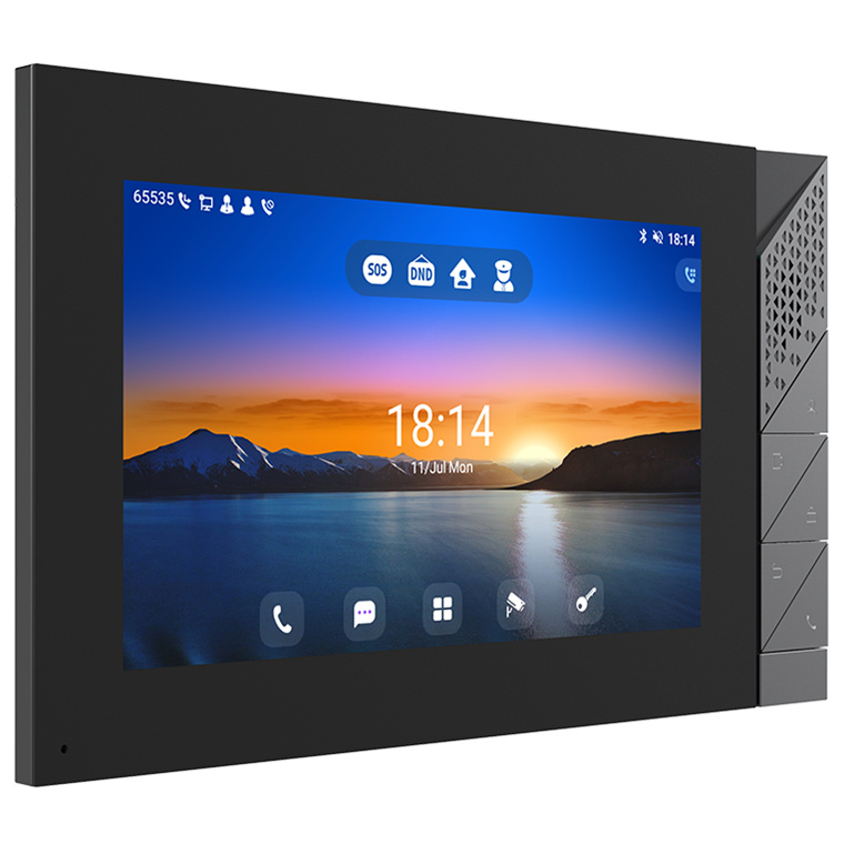 Fanvil i55A indoor station features 7-inch color touch screen with an intuitive UI. Based on Android 9.0 operating system, it meets industry application customization needs and secondary development. Featuring powerful functionalities like remote door opening and real-time monitoring for security devices, i55A serves as a management assistant for communities, villas and office buildings.