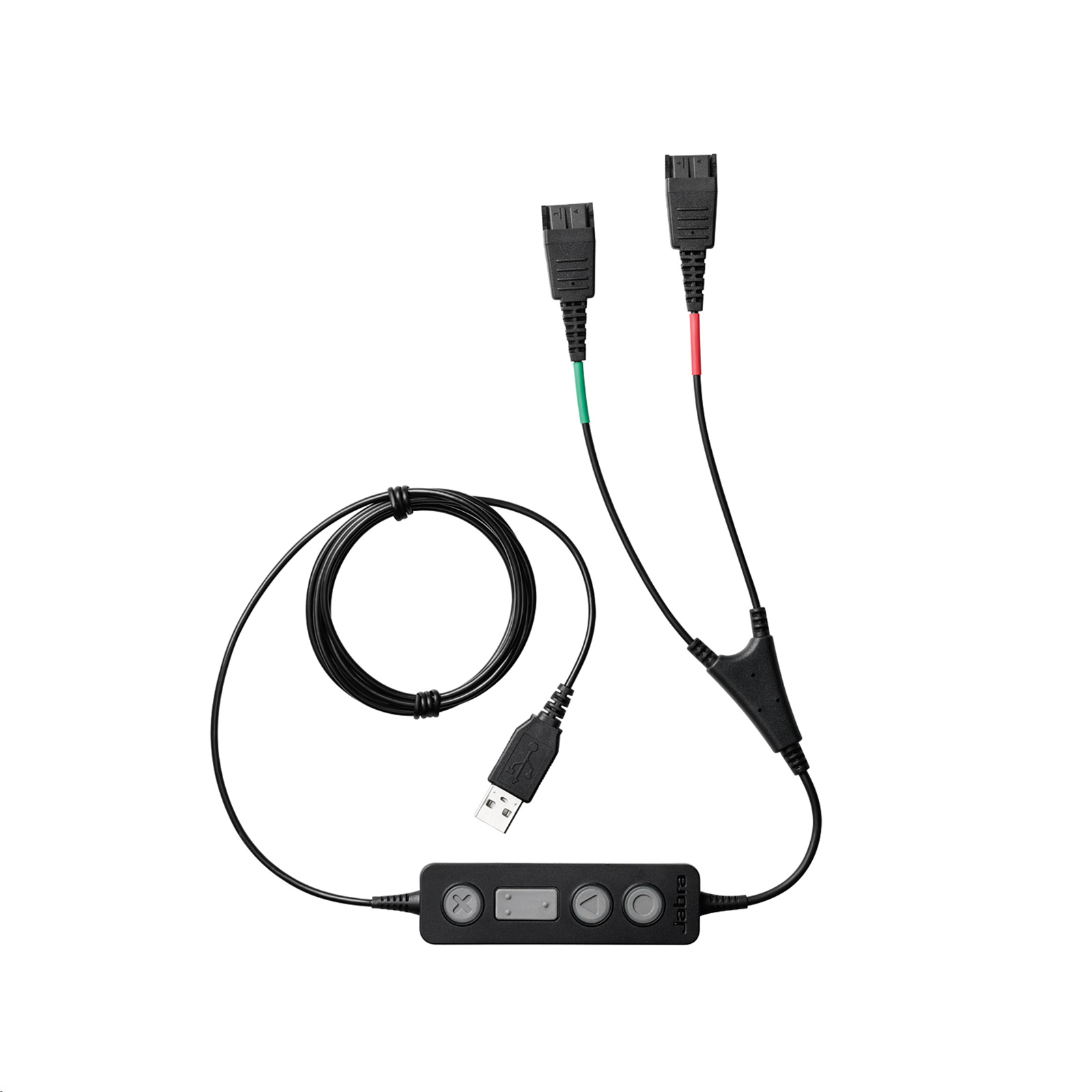 ?USB Y-training cable that connects two Jabra Quick Disconnect (QD) headsets to one PC, so supervisors can stay muted or join the conversation.