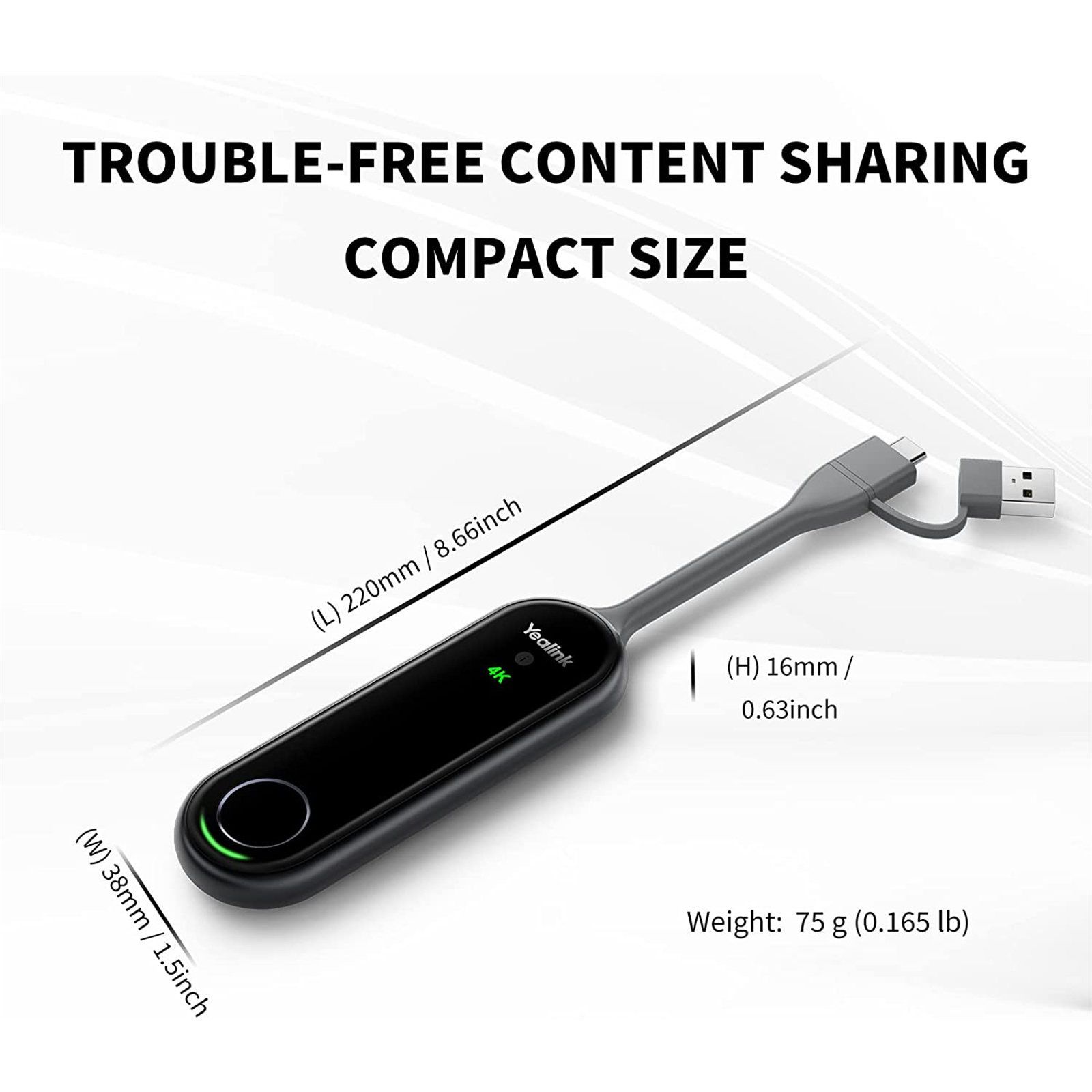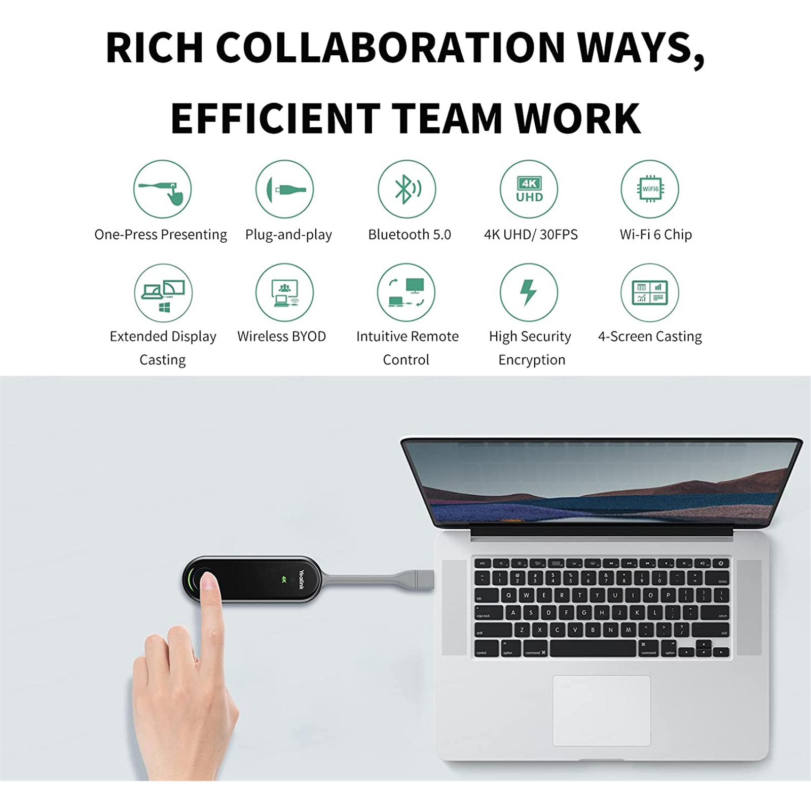 Featured with a compact size and intuitive industry design, Yealink wireless presentation pod WPP30 brings a trouble-free content-sharing experience to any conference room. Empowered with up to 4K/30FPS UHD hardware encode streaming output, WPP30 saves a lot of effort by eliminating the installation of any software or driver. Thanks to the high-performance 2x2 MIMO, Wi-Fi 6 module, WPP30 delivers a super clear, speedy and stable casting experience with low latency.