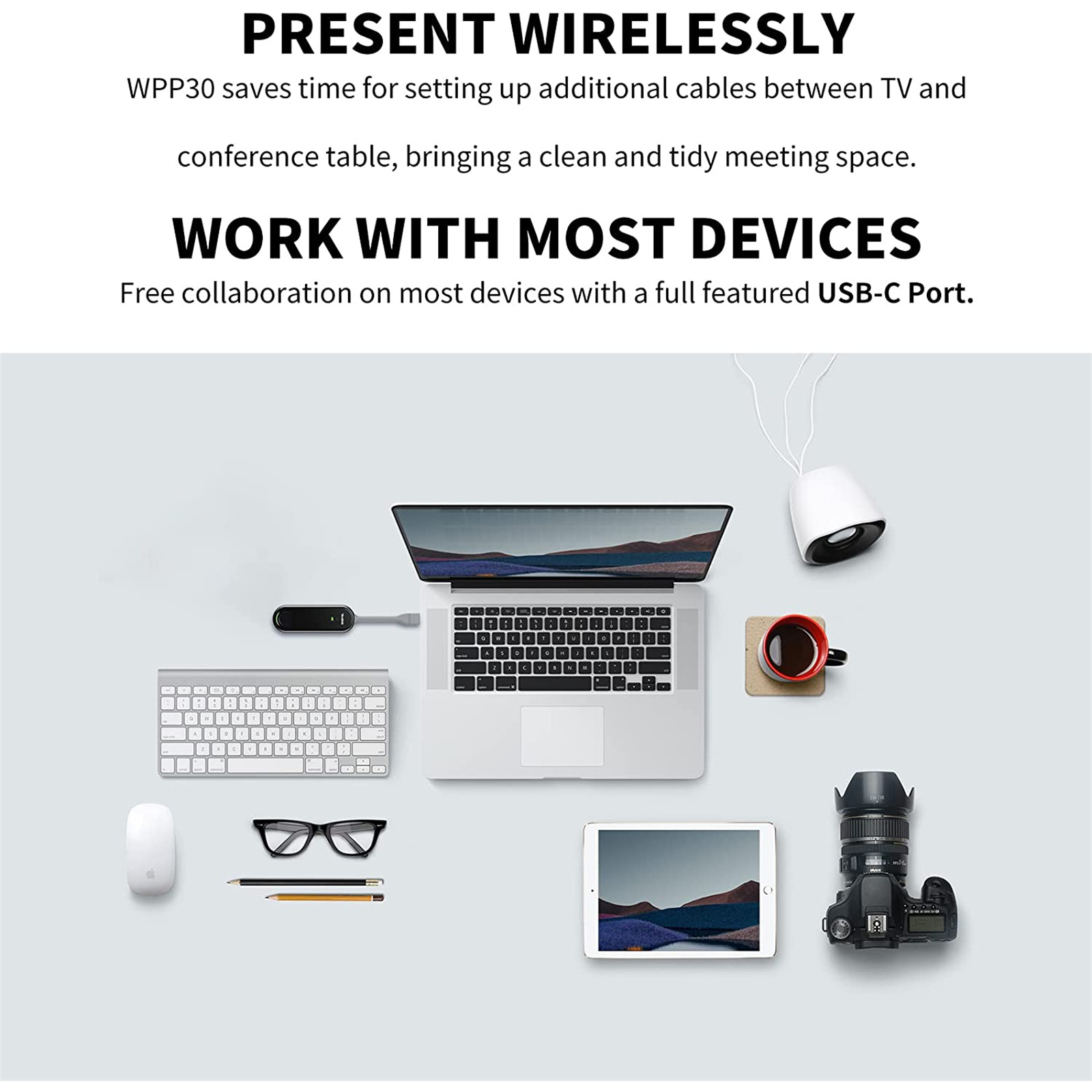 - Present Wirelessly, WPP30 saves time for setting up additional cables between TV and conference table, bringing a clean and tidy meeting space.