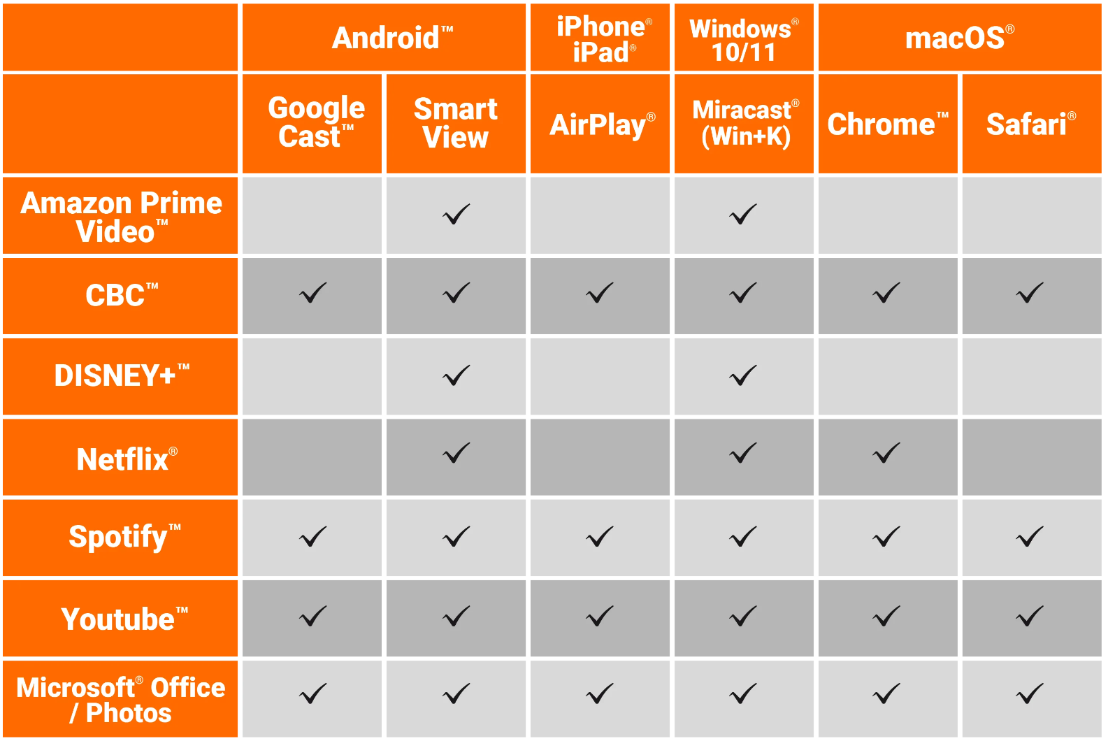 - Native support for AirPlay®, Miracast®, & Chromecast™ (Google Cast™)