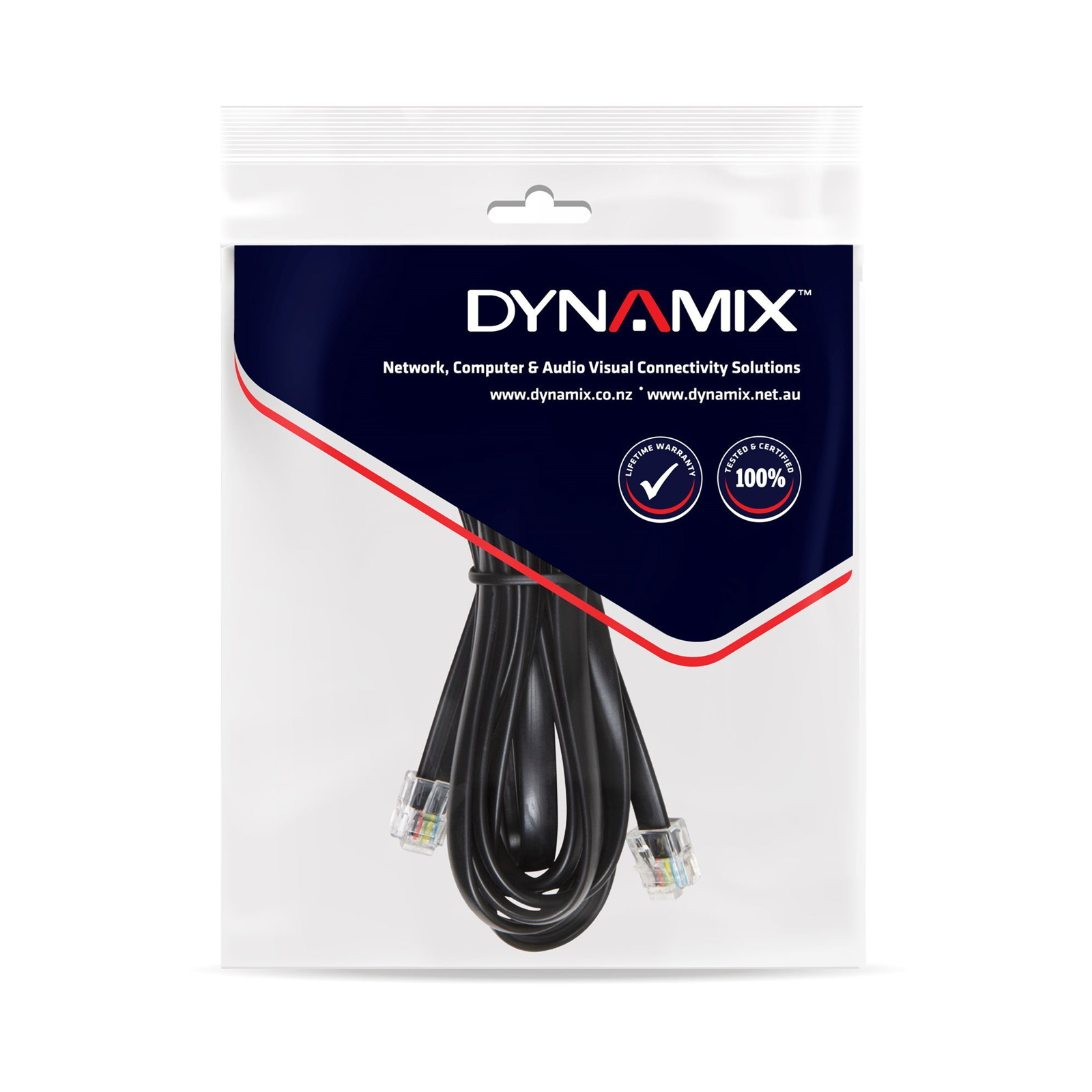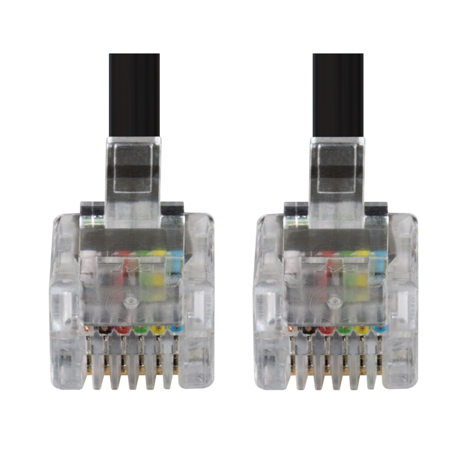 Our DYNAMIX telephone cable has RJ12 connectors at both ends and is designed to connect your phone, modem or fax machine to the wall jack. Its 6-wire construction handles dual phone lines while the heavy duty PVC jacket protects the cable's integrity. The cable has 6 pins that are connected straight through, that is contact 1 at one end joins with contact 1 at the other end, contact 2 to contact 2 etc.