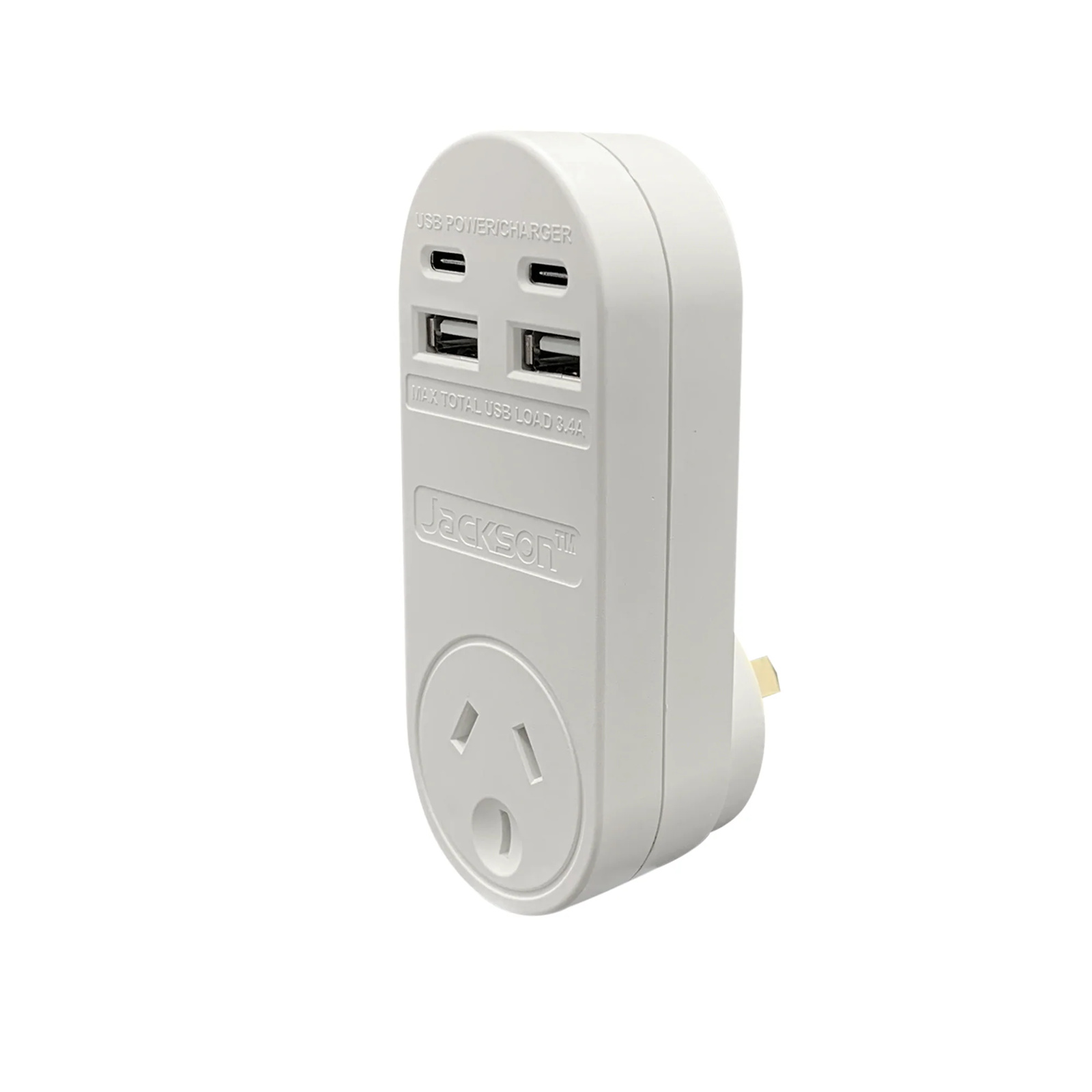 Jackson PT4USB3C USB 3.4A Wall Charger with 2x USB-A & 2x USB-C Ports - Matte White Plus 1x 3-Pin Socket - 230-240Vac - 50Hz - Charge 4x Devices Simultaneously - Compact Design - For Indoor Use Only