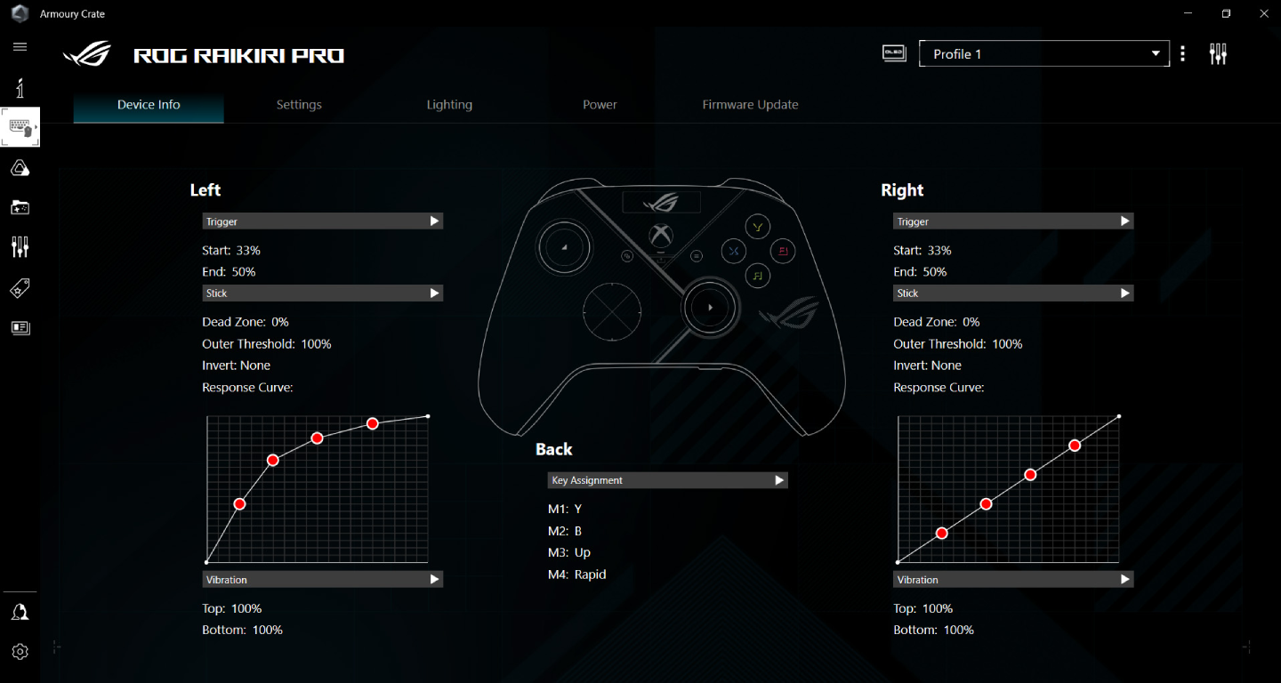 Use the Armoury Crate app to tailor controls to suit your play style or any game. A myriad of customization options are possible, allowing you to remap buttons, adjust OLED display settings, select controller profile, and set up low-battery alerts for wireless mode. You can also tweak vibration strength and trigger dead zones, and adjust joystick response curves.
