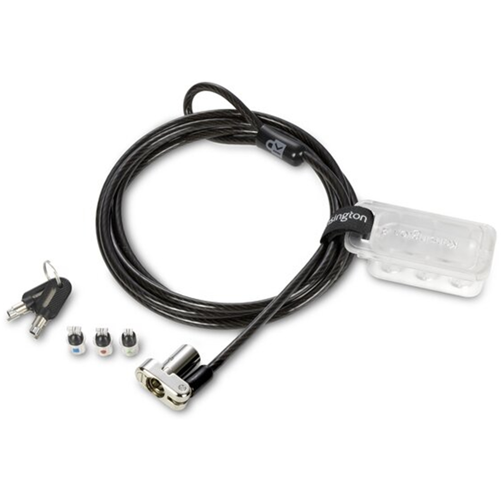 Now there's one keyed cable lock that secures it all. The Universal 3-in-1 Keyed Laptop Lock fits any laptop security slot - standard, nano, and wedge-shaped - helping to "future-proof" your locking solution. Lock tips are easily changed; a tether keeps unused lock tips handy. Common 5mm keying system, patented Hidden Pin™ technology, and carbon steel cable provide strong security against picking and theft attempts. Pivot and rotate lock head allows flexible movement and easy key insertion. Additional features include Register & Retrieve™ for quick, secure, and easy key replacement; and a five-year warranty backed by Kensington, inventor and worldwide leader in laptop security locks. All Kensington locks are verified and tested for strength, physical endurance, and mechanical resilience.