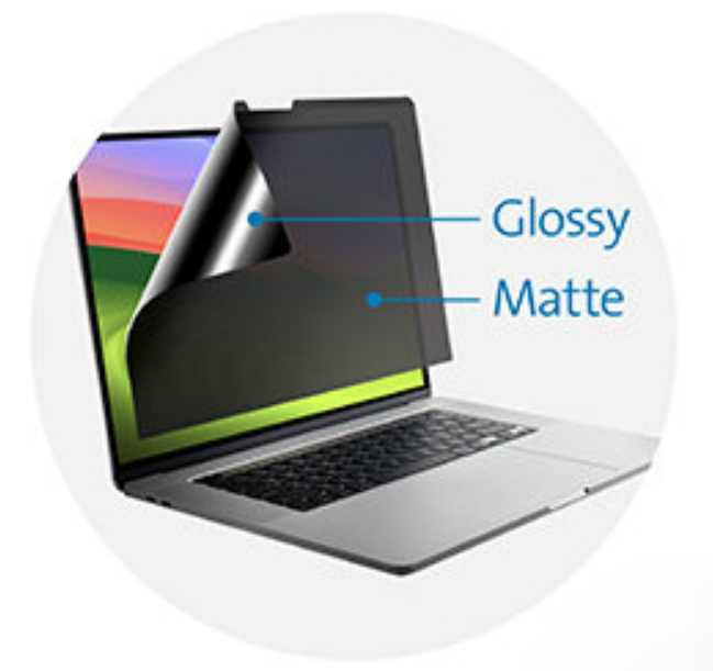 One side has a matte finish to reduce glare and fingerprints. The other side is glossy and provides a clearer view of the monitor. Magnets make it easy to detach and reattach.