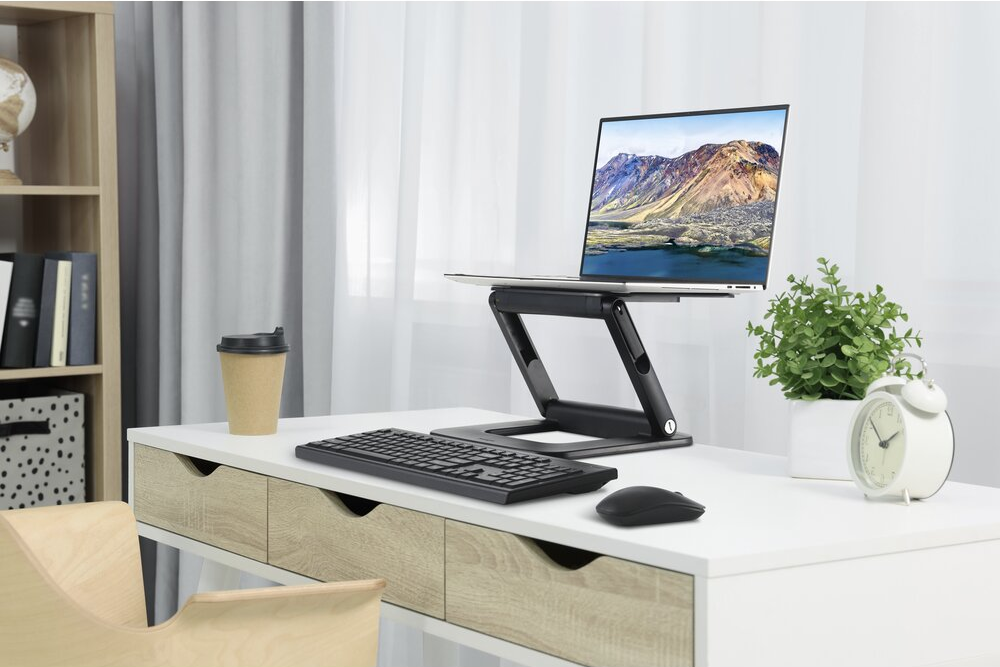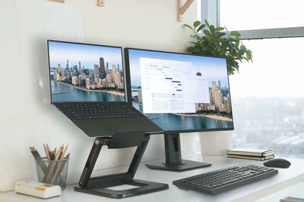 Professionals working in compact office spaces often face challenges when using multi-monitor setups featuring a laptop as one of the displays. Limited desk space can lead to discomfort, poor posture, and decreased productivity, making it difficult to maintain an ergonomic workspace. The SmartFit™ EQ Adjustable Multi-Angle Laptop Stand addresses these issues. It offers six customizable height and angle combinations to support proper ergonomic viewing angles and uses dual locking latches to ensure stability and simplify adjustments. Its durable and compact design not only conserves space but also conveniently folds flat when not in use. This stand enhances comfort and efficiency, making it an ideal solution for maximizing productivity in small workstations.