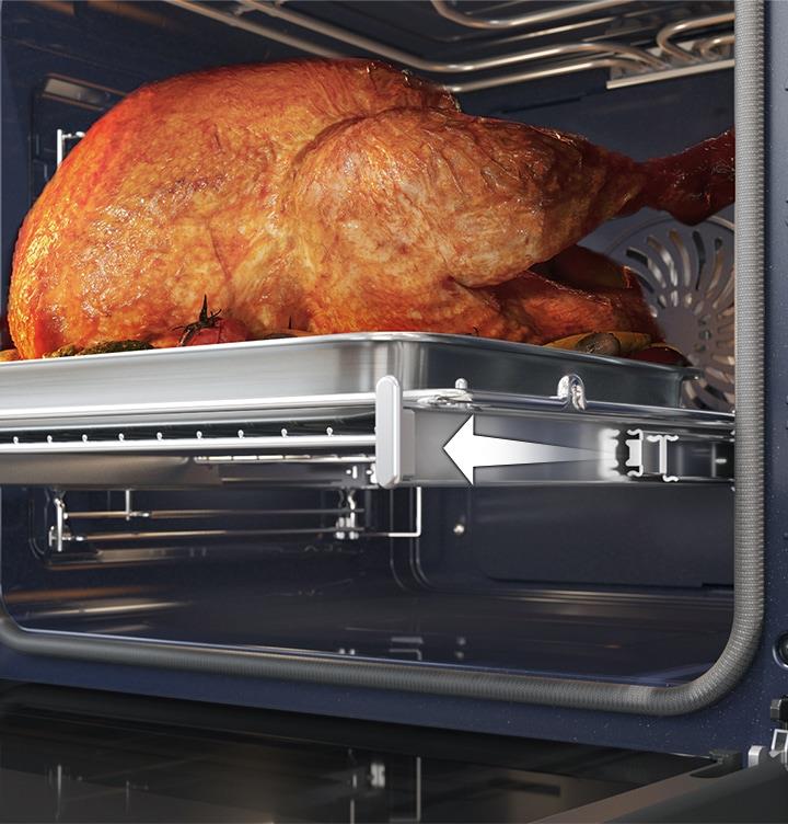 Get things in and out of the oven easily. The Telescopic Rail slides in and out smoothly with hardly any effort, even if you're using large or heavy dishes. It creates much less friction, so it's much easier to load and unload. You can baste, turn and season food without any spills.