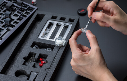 The ROG Azoth includes a complete set of tools for DIY switch lubing. The kit includes a switch opener, keycap puller, switch puller, lube station, brush, and bottle of Krytox™ GPL-205-GD0 lubricant.