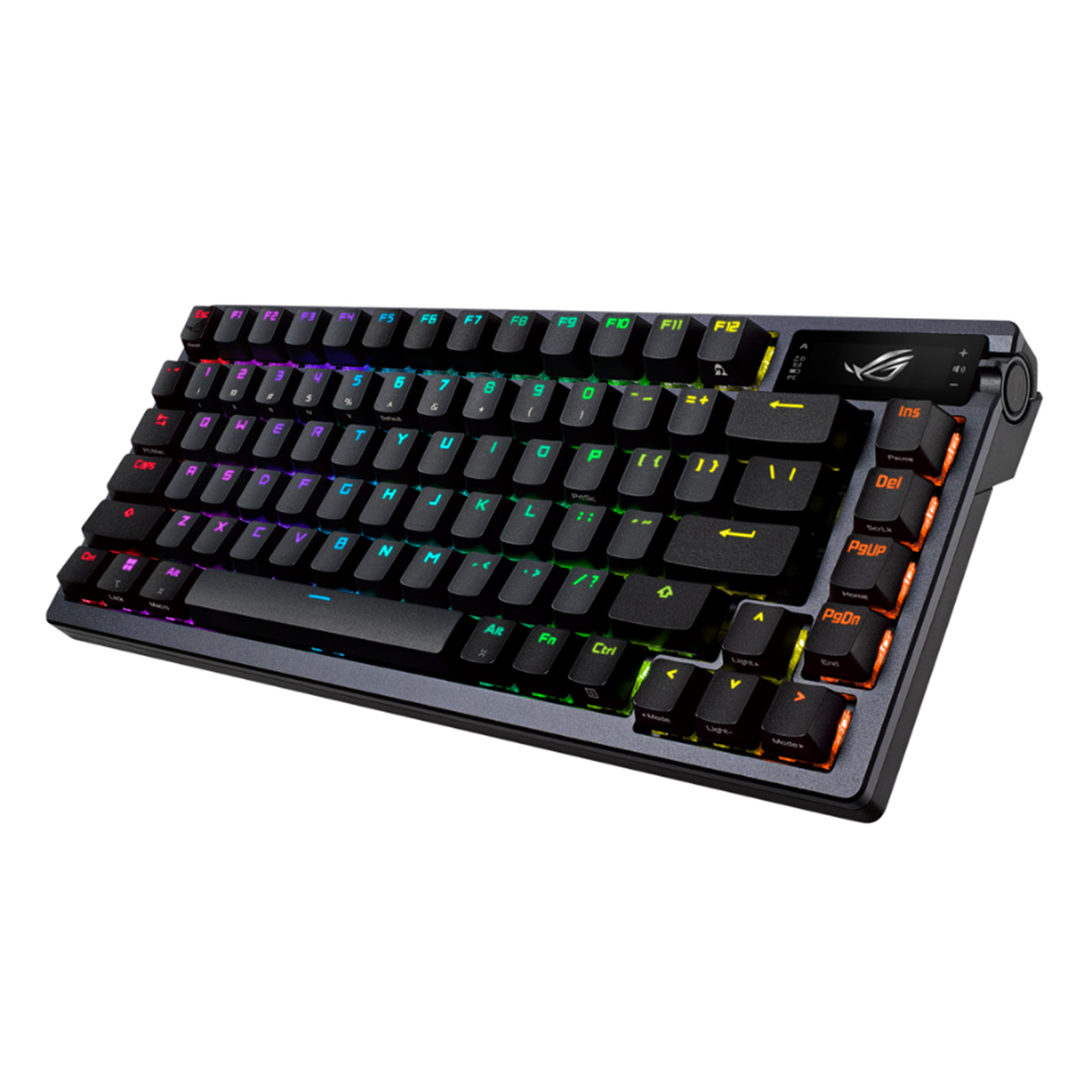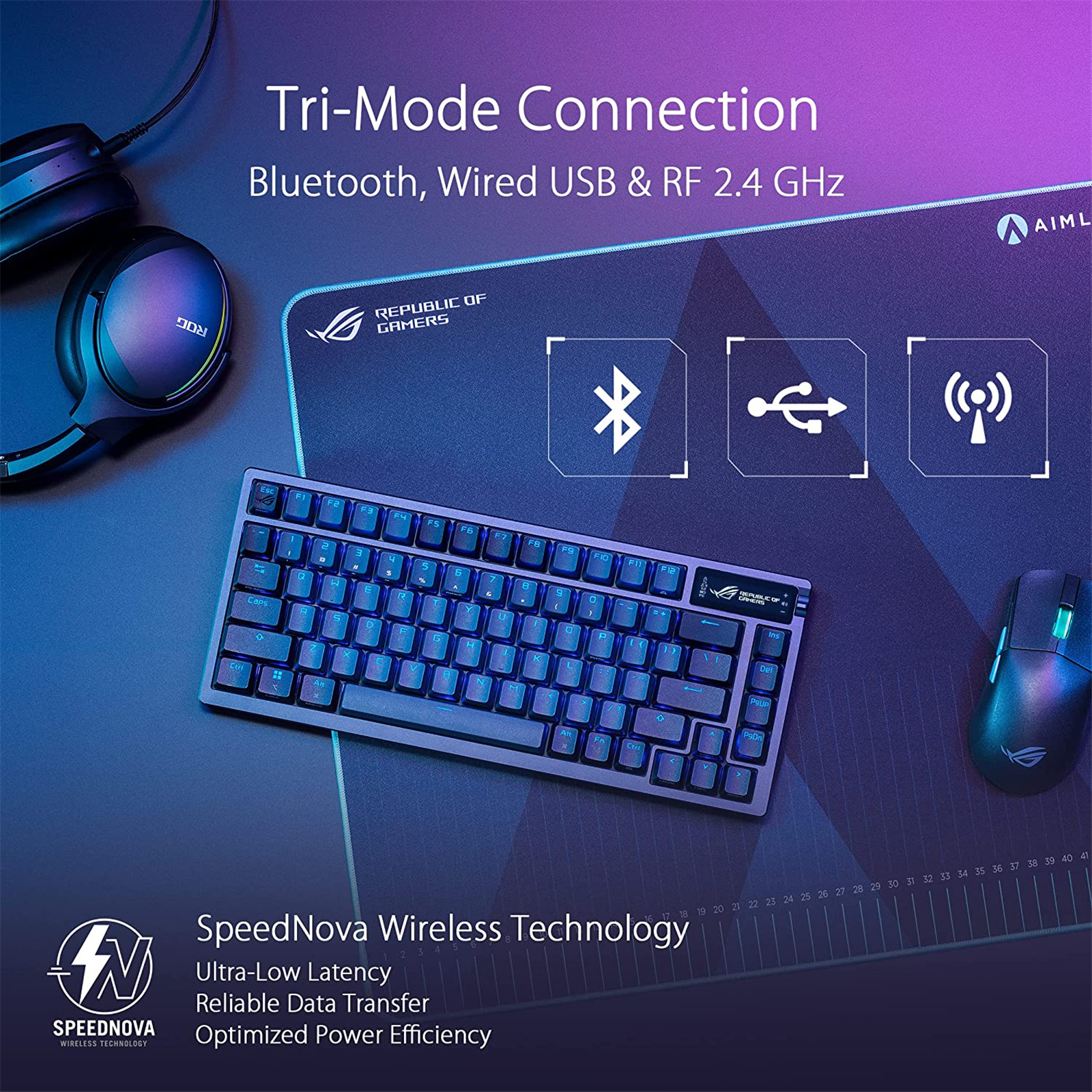 ROG Azoth is a 75% gaming keyboard bristling with DIY features traditionally found on premium custom keyboards. A metal top cover with silicone gasket mount and three-layer dampening, hot-swappable, pre-lubed ROG NX mechanical switches and keyboard stabilizer, ROG PBT doubleshot keycaps and bundled switch lube kit combine to create unprecedented typing experiences. ROG Azoth also has an OLED display with intuitive controls, versatile tri-mode connectivity with SpeedNova wireless technology in 2.4 GHz mode, three adjustable tilt positions, and MacOS support.