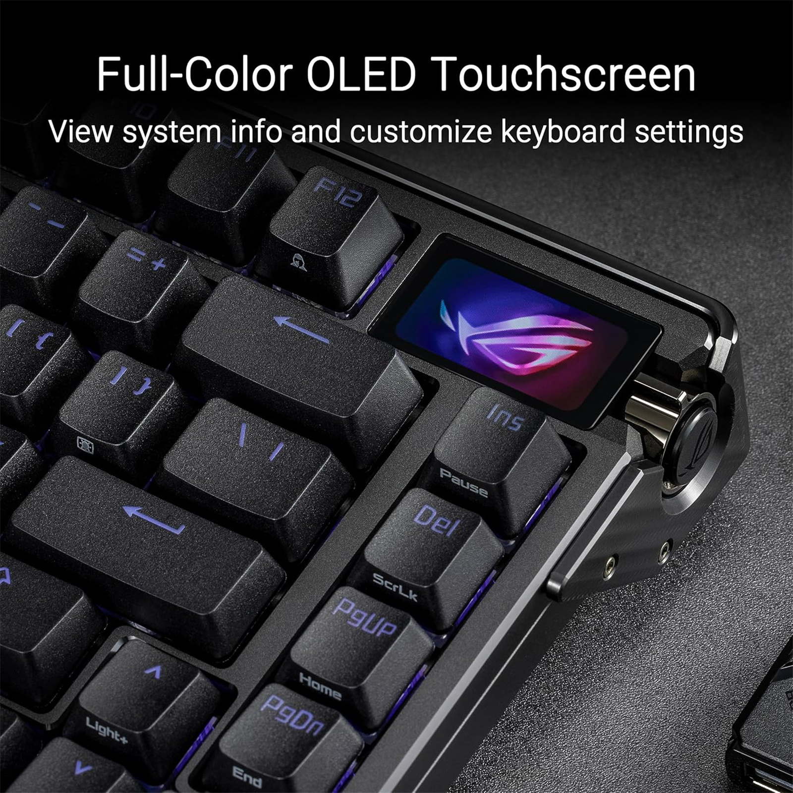 The ROG Azoth Extreme is a customizable 75% gaming keyboard with a premium aluminum-alloy chassis and metal frame. It features an 8000 Hz report rate with the ROG Polling Rate Booster and over 1600 hours of battery life in ROG SpeedNova 2.4 GHz wireless mode. The upgraded OLED touchscreen and three-way knob enable system monitoring and quick adjustments. The carbon-fiber positioning plate ensures a crisp typing sound, while three dampening layers absorb vibrations. An adjustable gasket mount with a paddle switch offers two typing preferences.