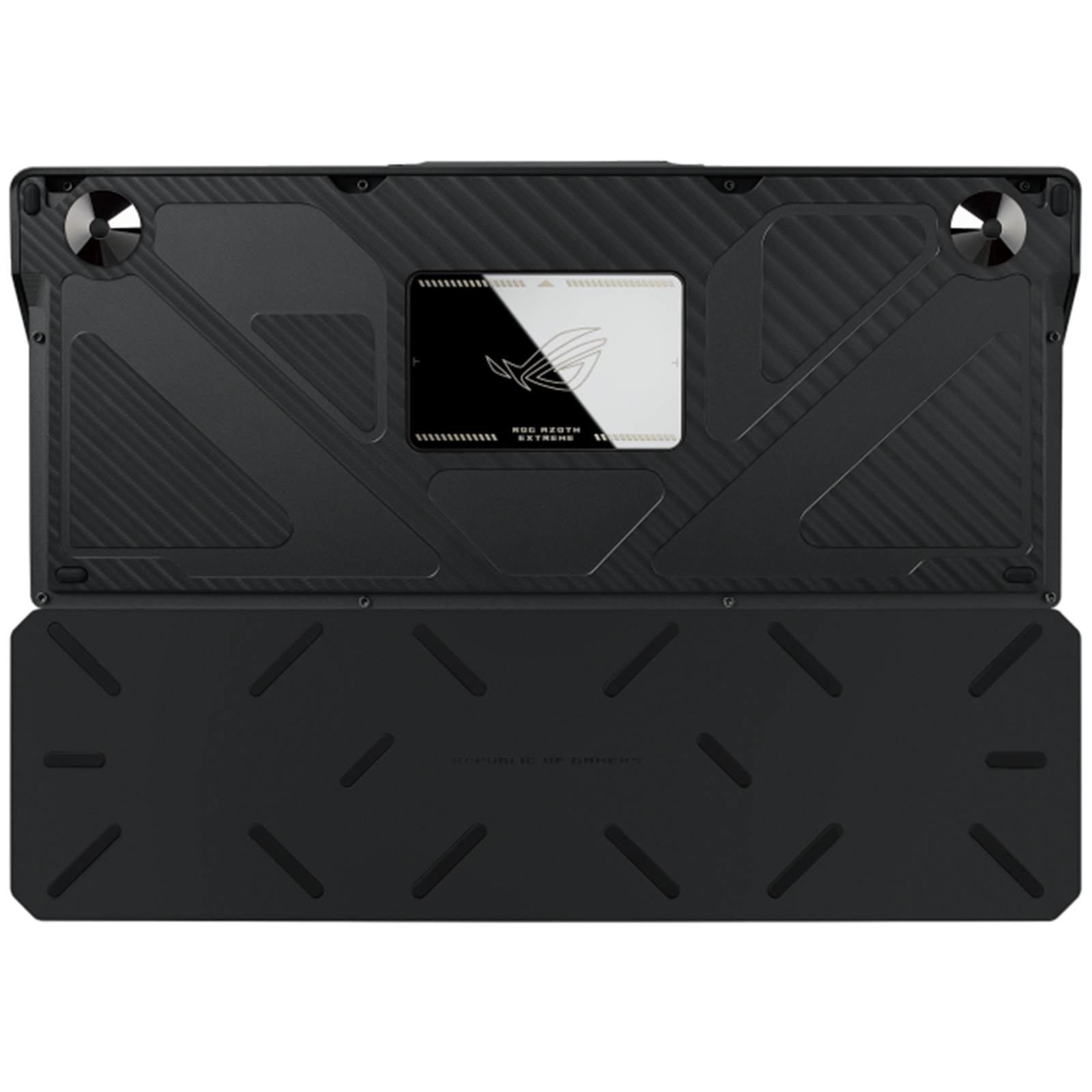 The ROG Azoth Extreme boasts premium aesthetics with its full aluminum-alloy chassis and metal frame, featuring a distinctive bladed pattern. The bottom chassis is achieved through 12 steps of intricate manufacturing processes, including sandblasting, anodizing, CNC machining, and more.
