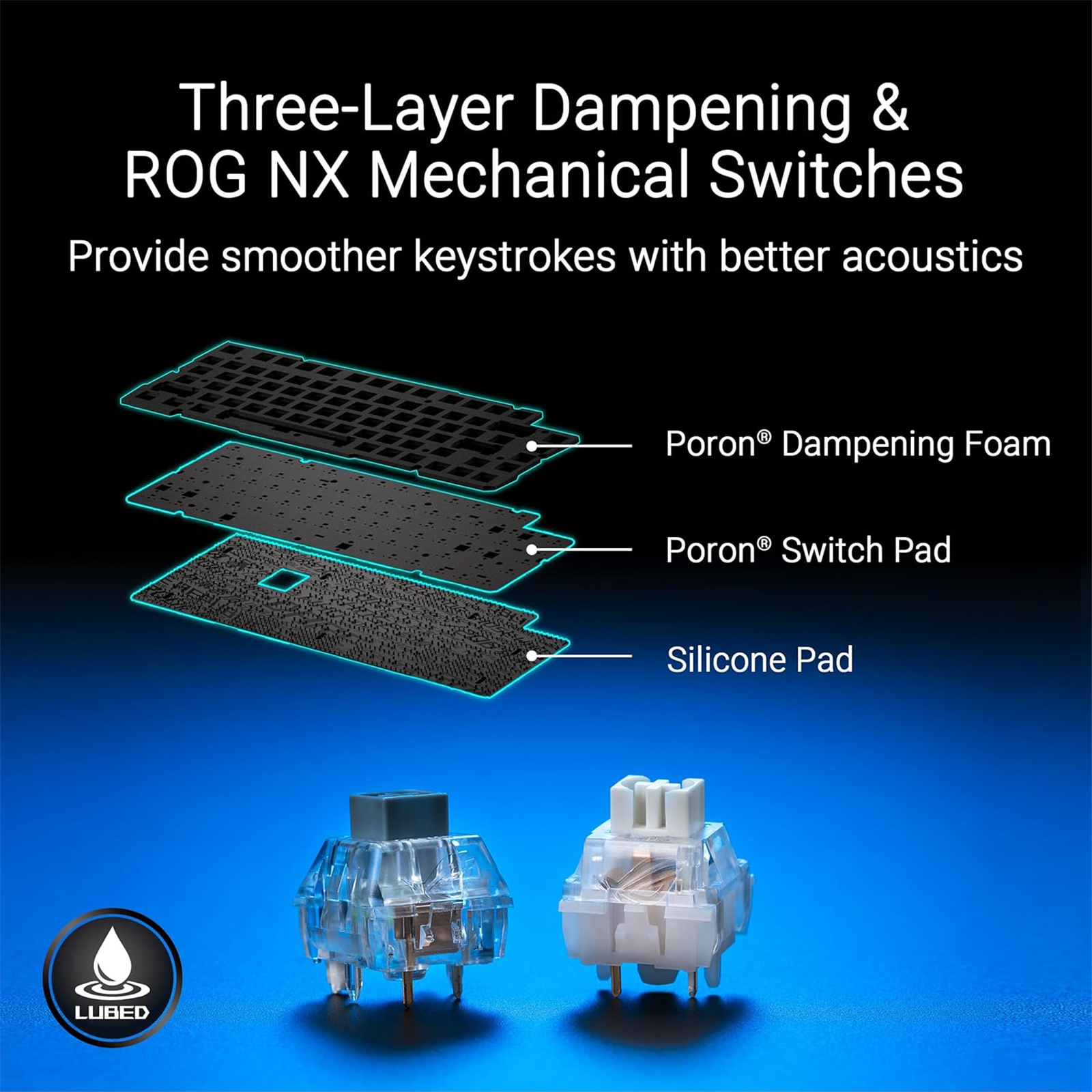 ROG NX mechanical switches utilize composite POM material for the stem with PC top housing and POM bottom housing to provide ultra smooth keystrokes, and the walled stem design enhances stability and prevents dust instrusion. special tuning is also done, coupled with factory pre-lubing, to give the ROG NX keystroke a very satisfying acoustics.