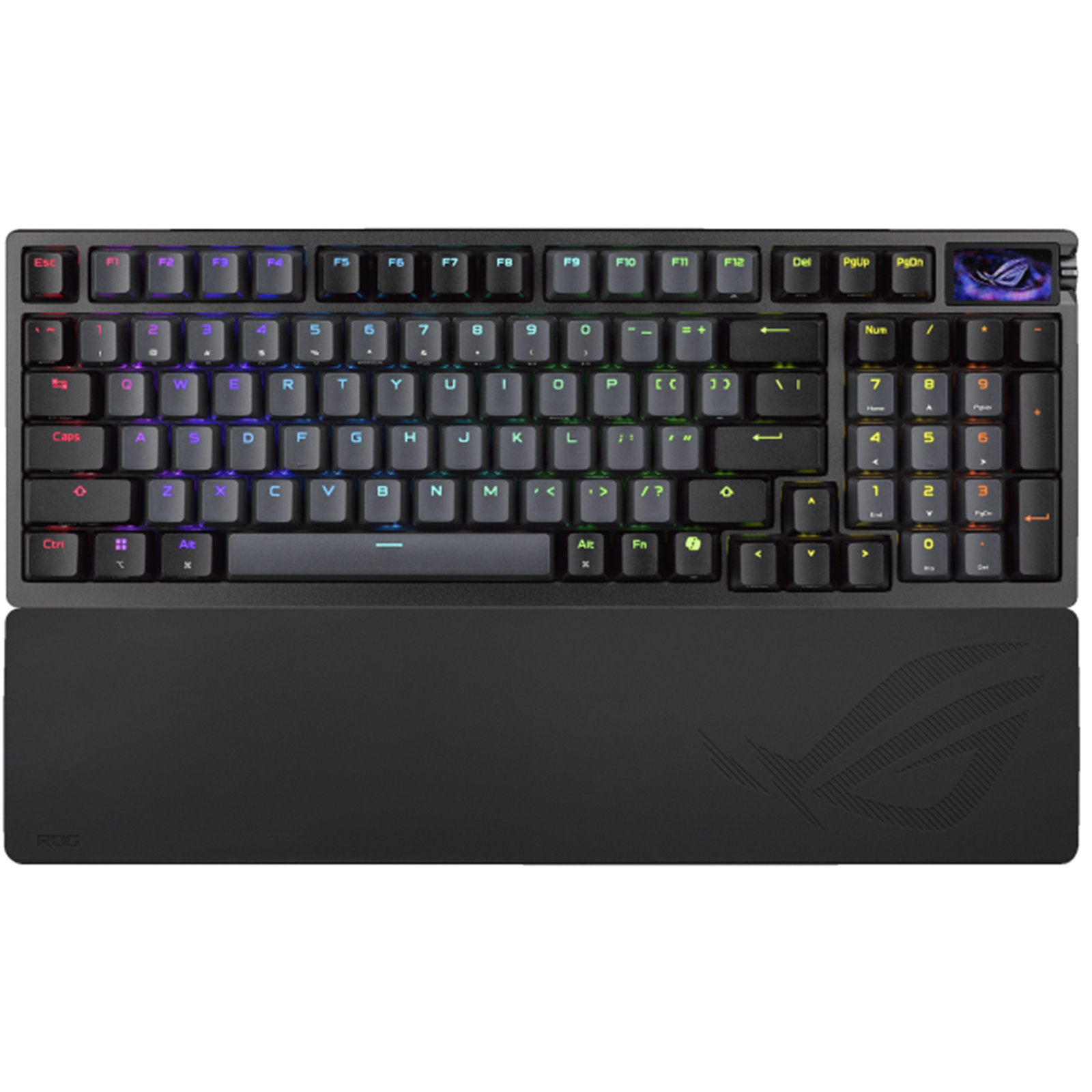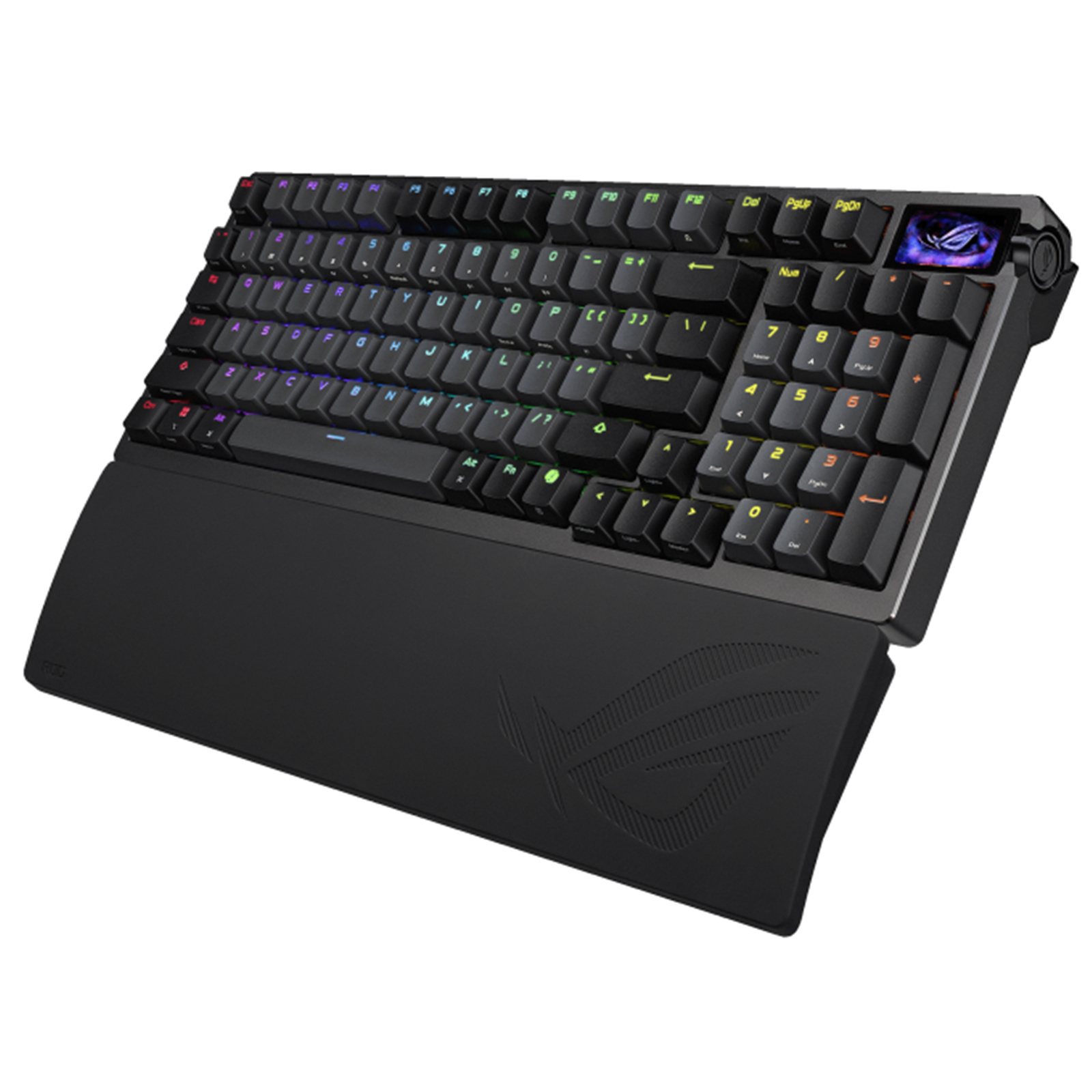 ROG Azoth 96 HE analog gaming keyboard with hot-swappable ROG HFX V2 magnetic switches and ROG Hall Sensor; featuring an OLED display, three-way knob, tri-mode connectivity with ROG SpeedNova 8K wireless technology, Zone mode, six-layer dampening and detachable silicone wrist rests