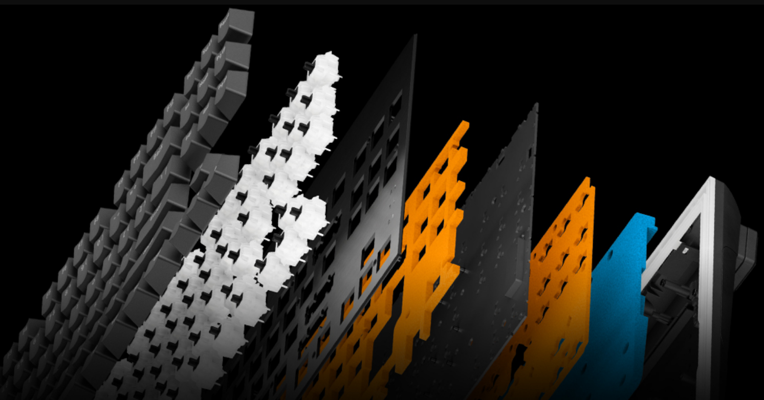 A total of 3 sound-absorbing layers ensure that Dark Mount lives up to the name of "be quiet!". One layer of foam is between the switches and the PCB, another is under the PCB, and silicone padding is filling the bottom housing. Any potential echoing noises are immediately muted. The space bar received a bonus layer of dampening, with foam inside the keycap body to reduce echo effects.