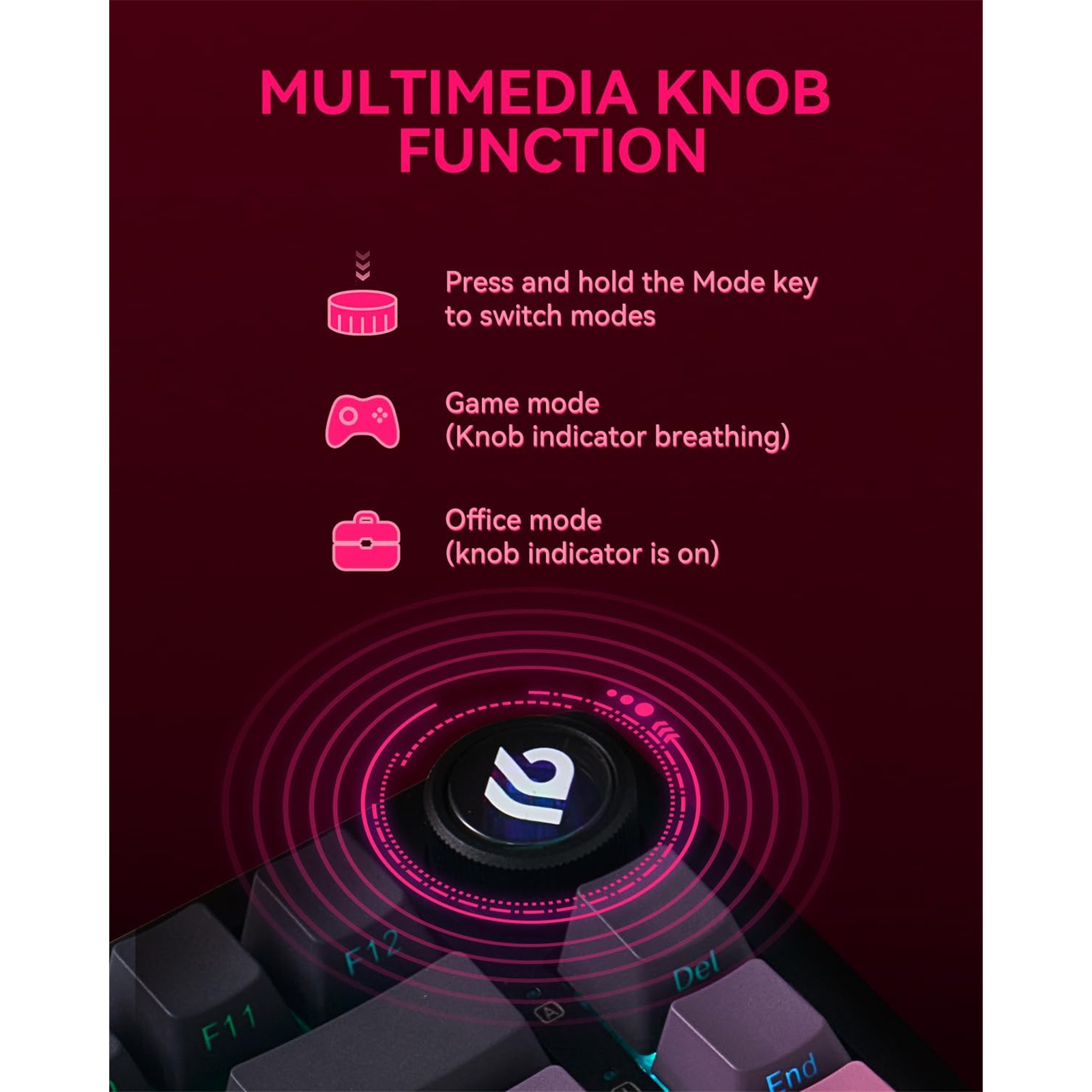 The LED keyboard features 16.8 million RGB light color . Lighting brightness and effect can be adjusted by the knob or the FN+key combination.