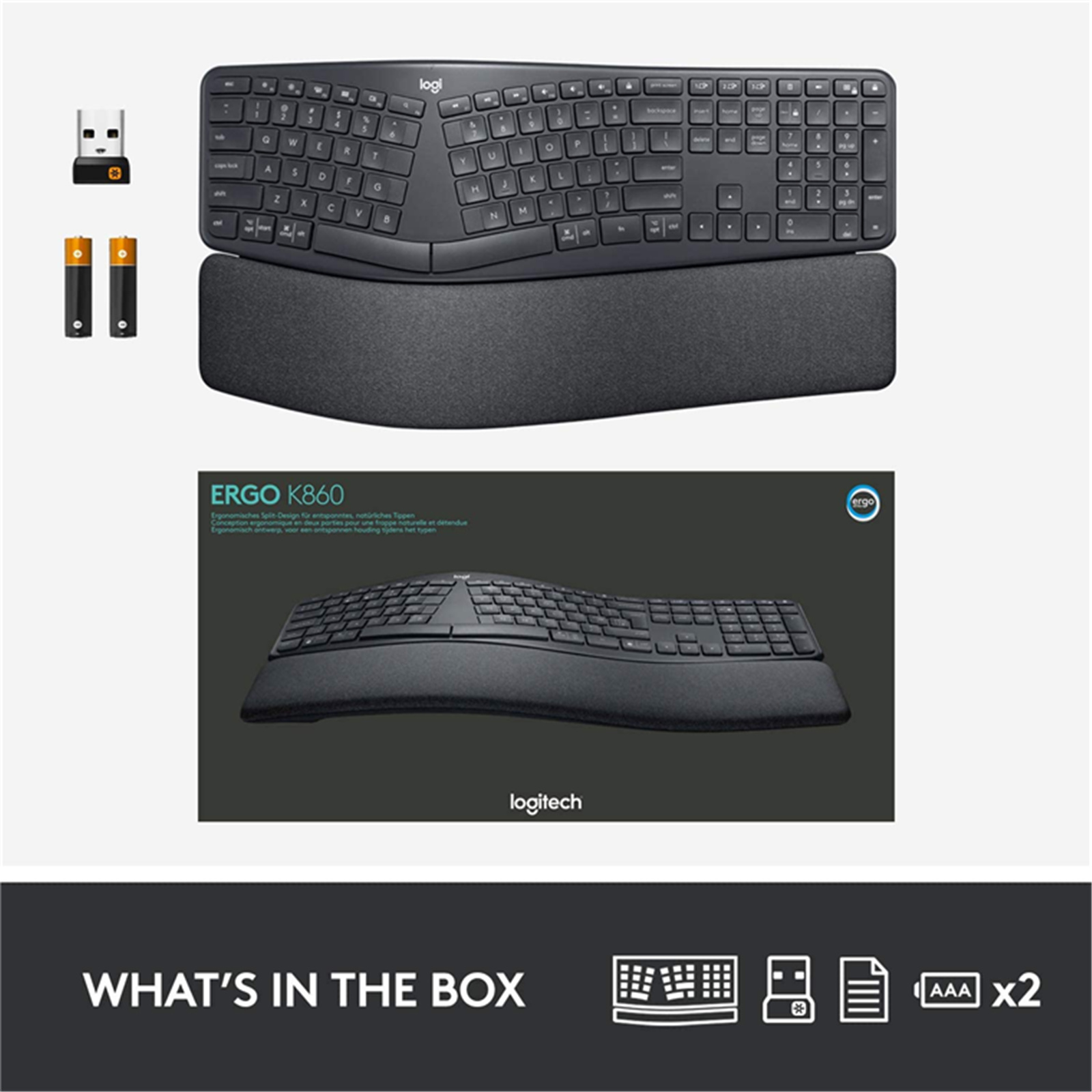 ERGO K860 stays powered for up to two years on the included AAA batteries. Battery life may vary based on user and computing conditions. When it's time to recharge, the battery indicator light glows red.