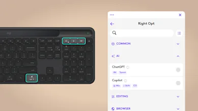 Streamline workflows with built-in shortcuts that are customizable through Logi Tune, including the F-row keys, AI Launch Key, meeting controls, and more5Out of the box, the AI Launch Key opens Copilot in Windows or Gemini on ChromeOS. Copilot requires Windows 11 or later and Gemini requires Chrome version 133.0.6882.0 or above. Meeting control keys require Logi Tune for or Logi Options+ for full functionality. Available for Windows and macOS at logi.com/tune or logi.com/optionsplus..
