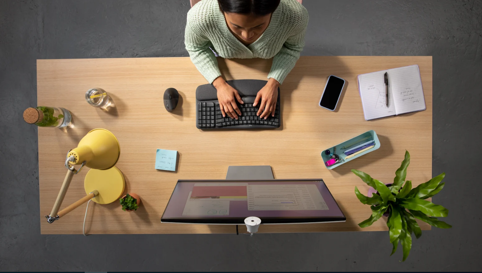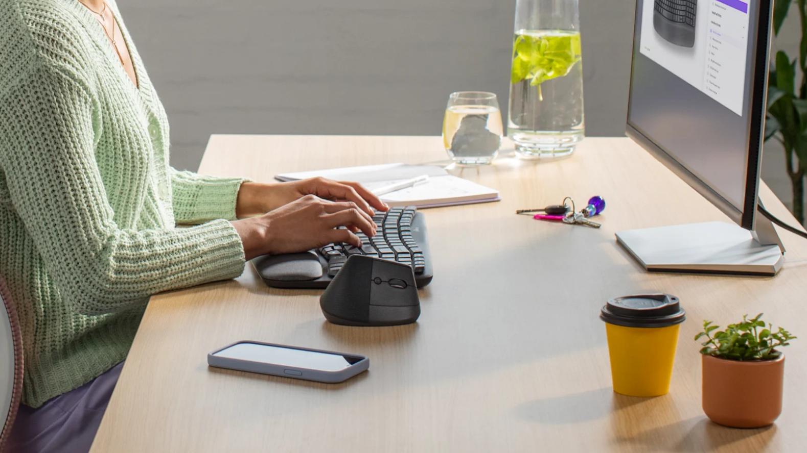 Wave Keys' compact frame allows you to bring Lift closer to your body, placing your shoulder in a comfier, more natural position as you work.* (*Mouse and keyboard plastic content: minimum 46% post-consumer recycled plastic. Excluding plastic in printed wiring assembly, receiver, battery, and packaging)