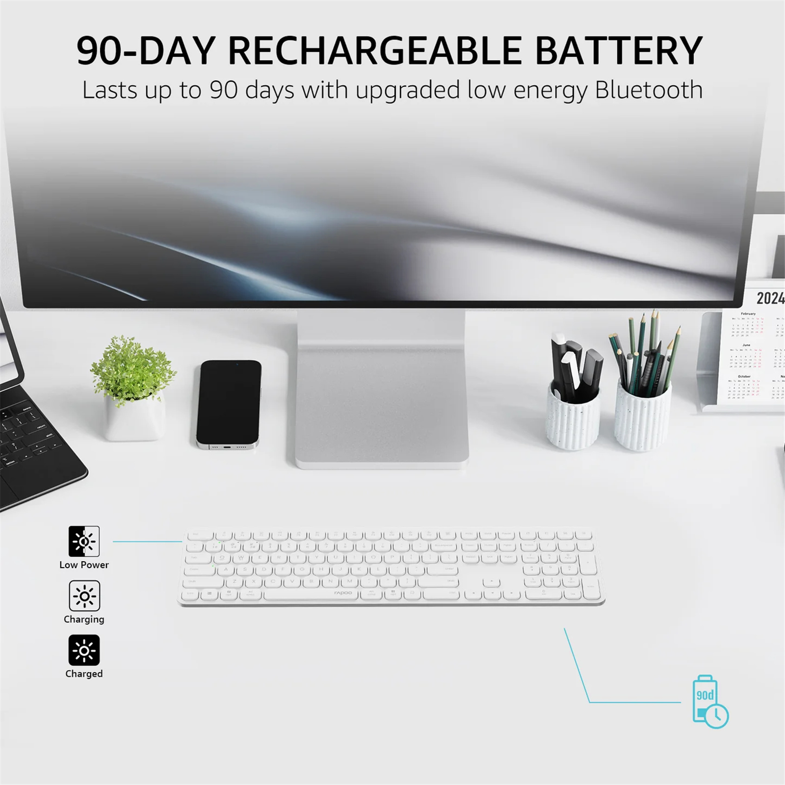 Rechargeable with 90-Day Battery Life: Upgraded with our latest low-power technology, the E9550L wireless keyboard can run up to 90 days on a full charge. In addition, the USB-C supports a whole day use on a 10-minute fast charging.