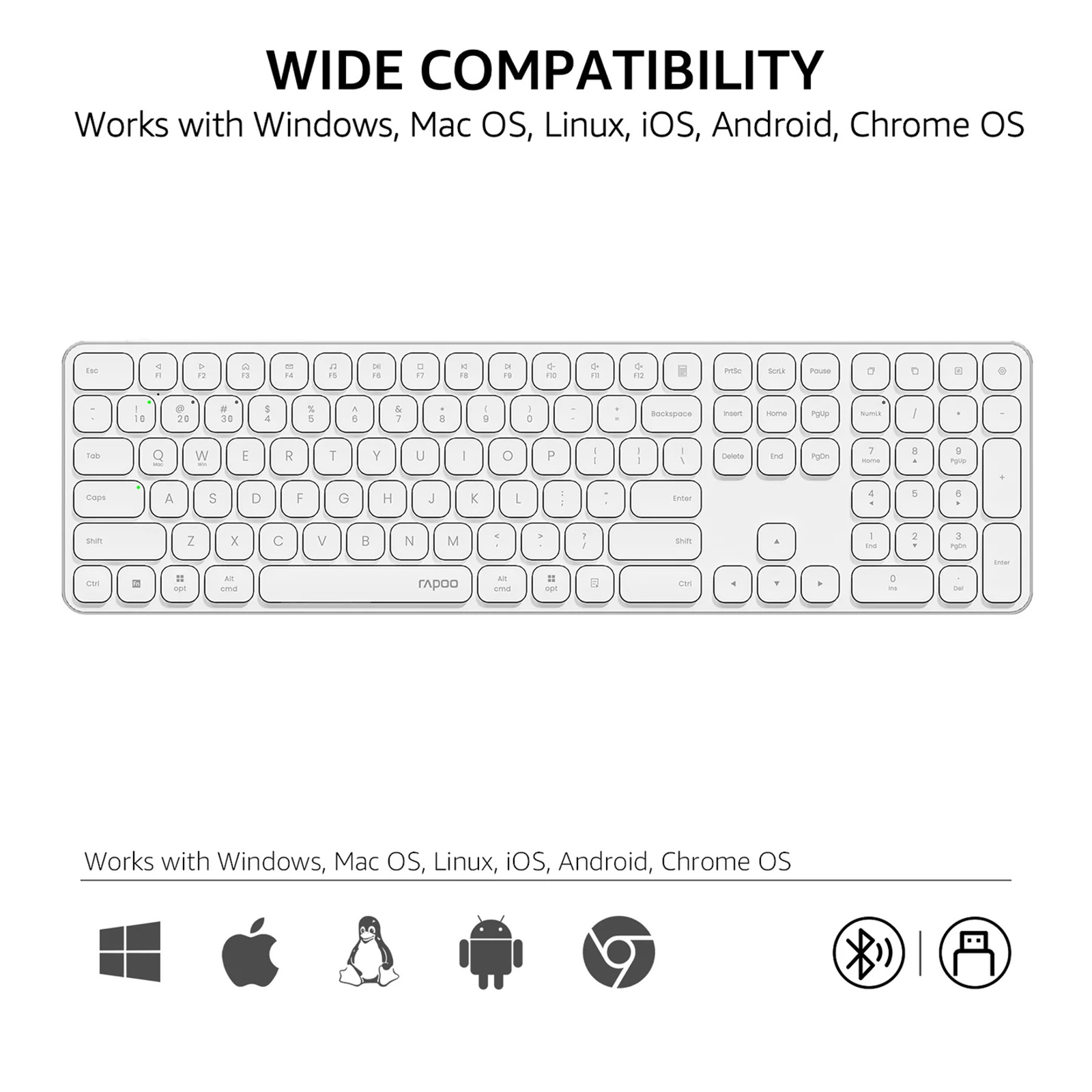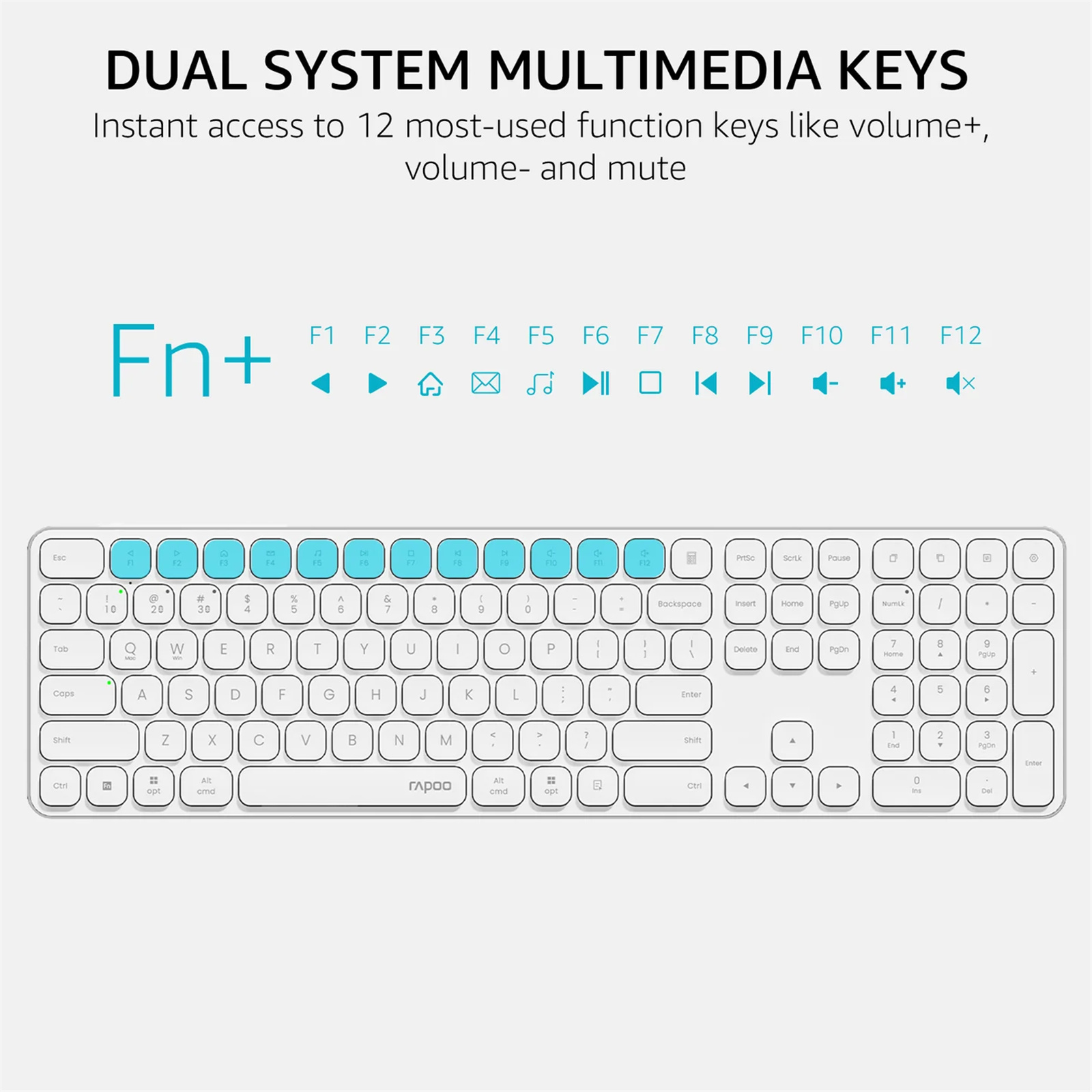 110-Key Complete Layout: A standard keyboard with number pad and all the keys you need, the well-spaced chiclet keys deliver fast fluid laptop-like typing, the 12 multimedia hotkeys provide quick access to most widely used functions such as play/pause, volume +/-, email --- Windows and Mac OS dual-system supported.