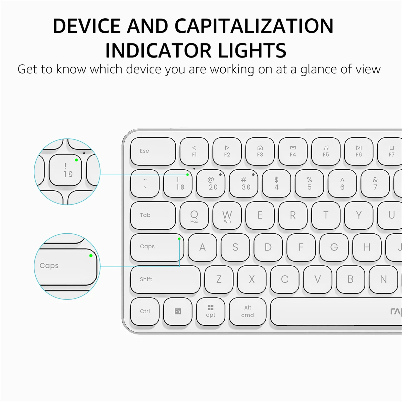 Refined Details from Customer Voice: The latest version has added device and capitalization indicator lights for making it easier to find which device you are typing on, and eliminating the inconvenience caused by not knowing the uppercase or lowercase; What's more, we've also added a battery indicator for better power management.