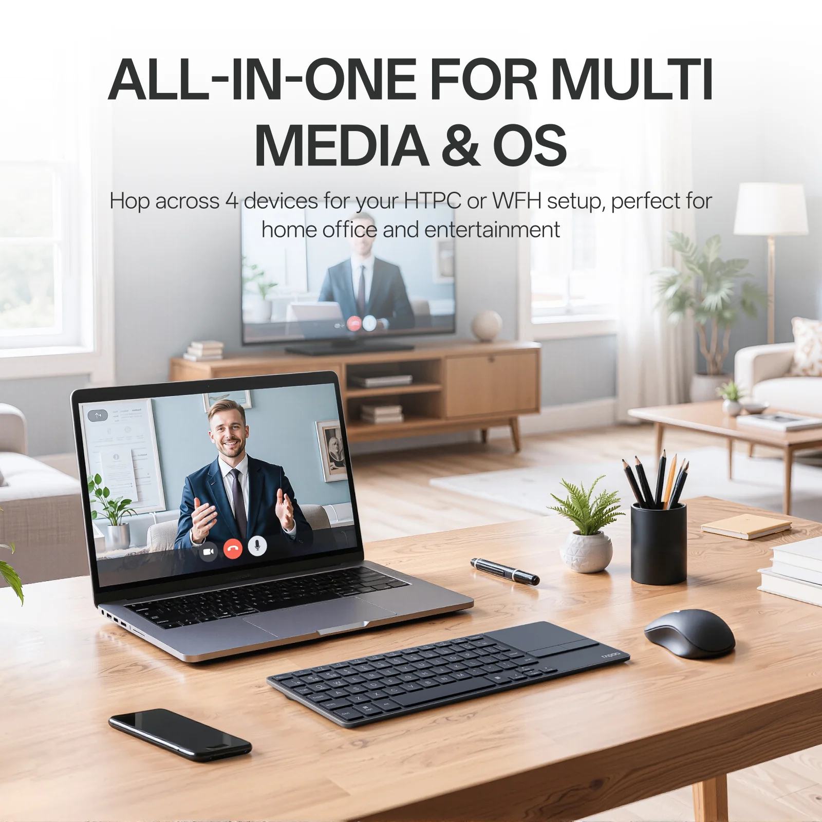 Featuring Bluetooth 5.0/4.0 + 2.4GHz tri-mode wireless connectivity, this portable HTPC keyboard provides a great way to navigate, browse, search or type on your PC-connected TV, tablet, steam deck, gaming console, SBCs, mini pc, phone and other devices with Bluetooth or USB-A port.
