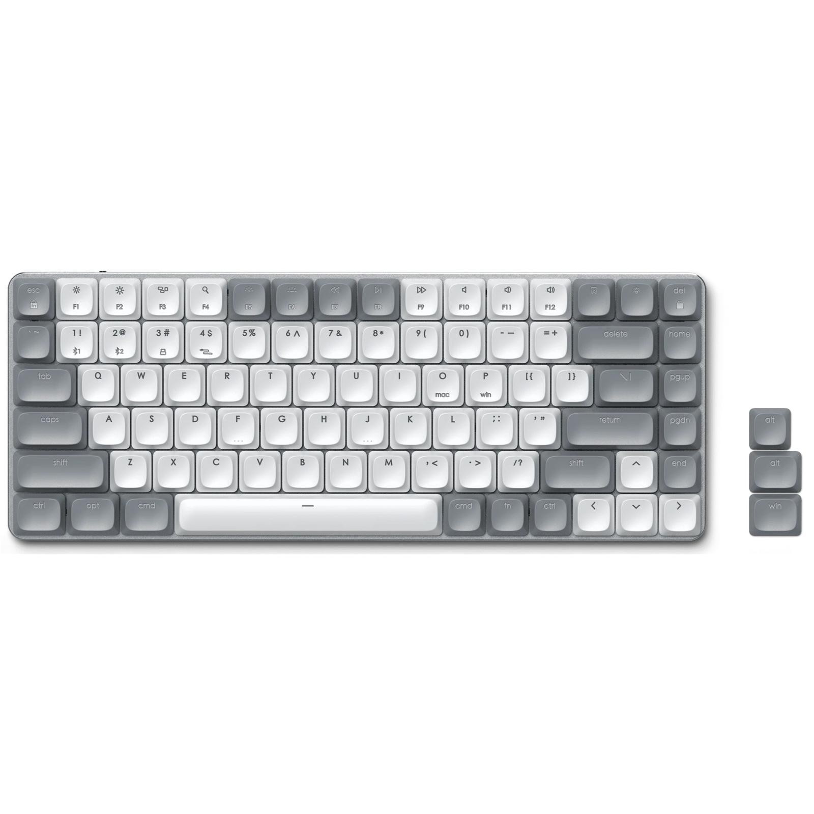 The wireless keyboard can connect to four devices at a time and supports Bluetooth 5.0. Compatible with both Mac and Windows, it includes swappable keycaps for Windows shortcuts.