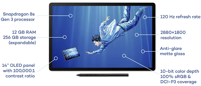 STUNNING 14" OLED DISPLAY: Crisp 3K (2880 × 1800px) resolution with wide color gamut (100% sRGB & DCI-P3) for vivid colors and true blacks, with Premium Texture etched glass delivers pen-on-paper feel with minimizing parallax