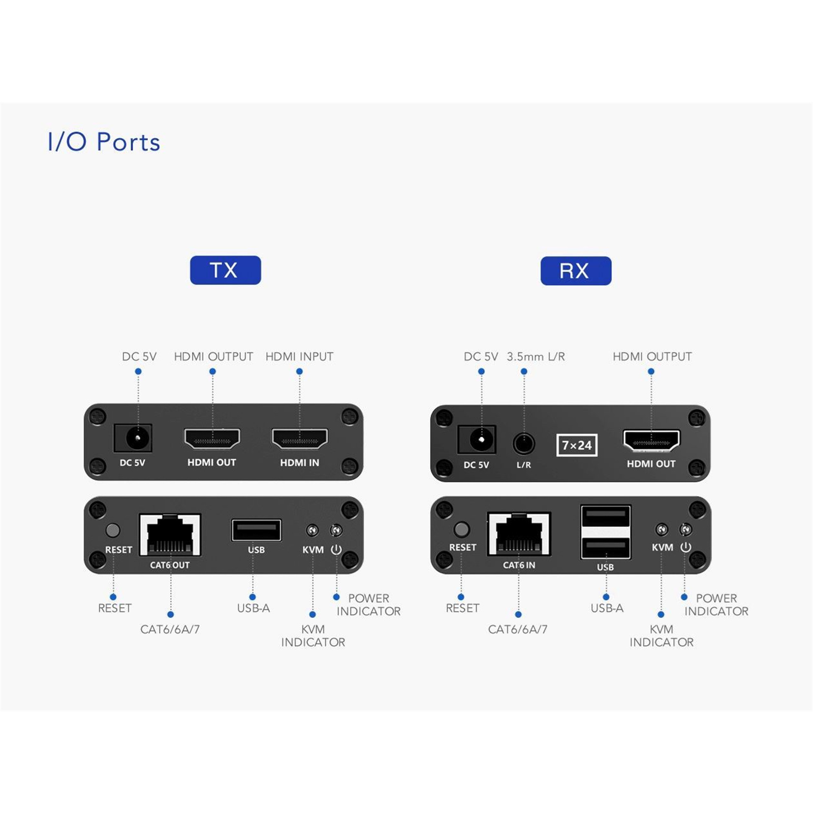 HDMI Extender includes a transmitter unit and a receiver unit, allowing the HDMI signal to be transmitted up to 70m at 1080p resolution using a CAT6/6A/7 network cable. It adopts a point-to-point connection configuration. Supports KVM remote control and 3.5 mm stereo audio output.
