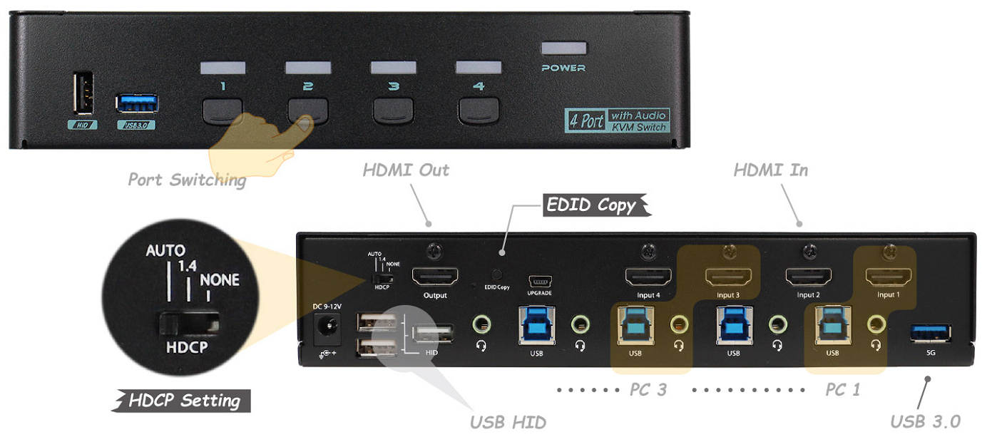 This 4 Ports HDMI 2.0 KVM Switch enables users to copy or automatically learn EDID from the connected monitor, and the exclusive HDCP slide switch on the rear panel allows users to select the 3 preset HDCP modes: