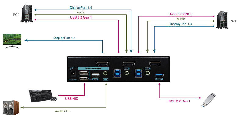 PAAG-E3112B 2 Ports 8K DisplayPort KVM Switch with 3.5mm Audio lets you control 2 DisplayPort computers with one set of USB Keyboard, Mouse, Monitor, and USB Devices. You can easily switch 2 computers using the user friendly hotkey control function of the KVM switch. Real-time USB HID ports provide you amazing seamless HID switching experience while the USB 3.2 Gen 1 ports offer excellent 5 Gbps I/O speed.