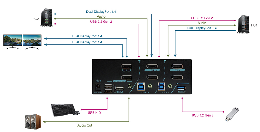 The Real-time USB HID ports give you an amazing seamless HID switching experience and the USB 3.2 Gen 2 ports provide excellent 10 Gbps I/O speed. PAAG-ET3122B, Dual Monitor 4K 144Hz DP KVM, is Windows, Mac, Linux, and Chrome OS supported, DisplayPort 1.4 compliant, capable of Deep Color; Dolby True HD, DTS-HD Master, and stereo audio; RGB, YCbCr (4:4:4), and YCbCr (4:2:0).