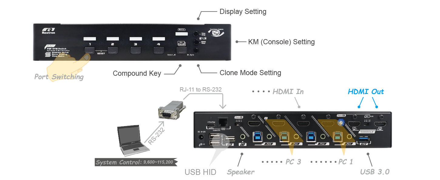 QSBM-3214 supports various ways of control that can be done through front-panel buttons, Keyboard, Mouse, or Serial command. Built-in RJ-11 / USB-C port (DB9 to RJ11 / Virtual Com Port) provides users easy and convenient serial connection. Switching via a serial command on Rextron HDMI Matrix KVM is specially designed for industrial control and communication purposes to enhance the functionality of KVM Switch and serial device management.