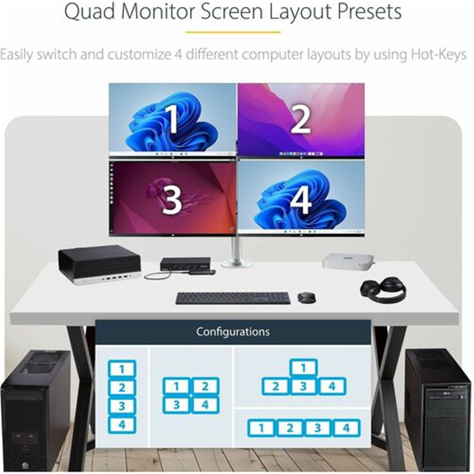 - SCREEN LAYOUT PRESETS: Monitor layouts controlled via hotkeys are designed to accommodate a variety of physical monitor setups, allowing for seamless mouse movement across host monitors; 4 different preset display configurations available