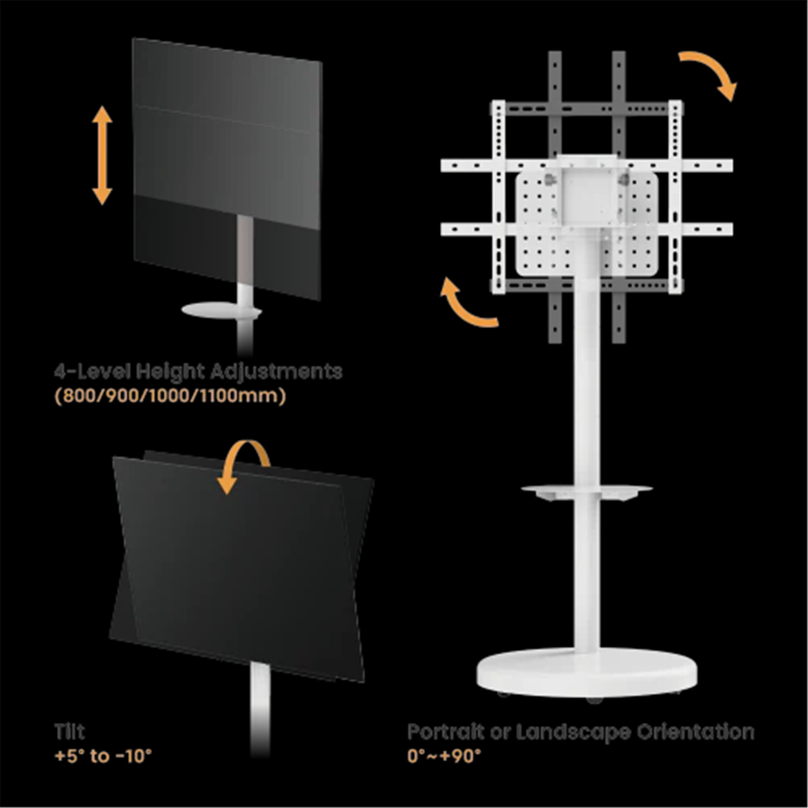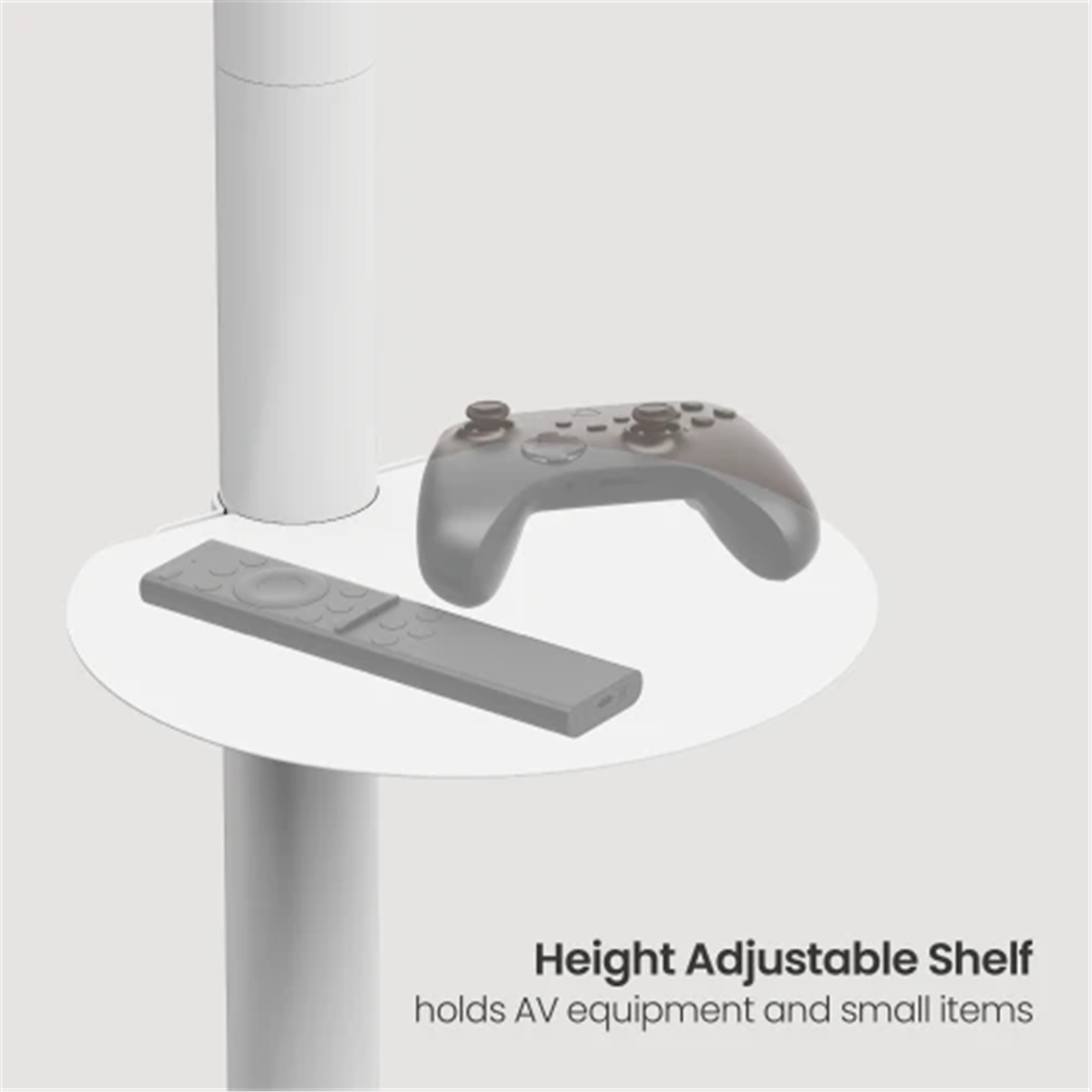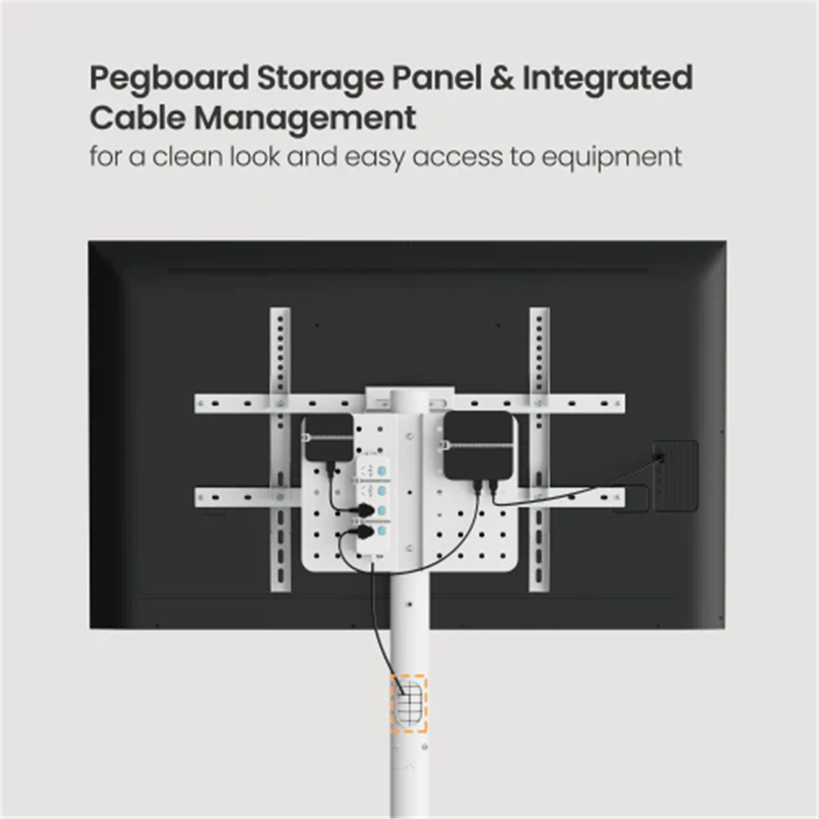This Heavy-Duty Mobile TV Floor Stand is the perfect blend of durability, flexibility, and style for your entertainment needs! The column can be adjusted to four heights, allowing users to position it as desired. Equipped with a pegboard panel with integrated cable management for device access and a clean look. Additionally, the stand is equipped with five rolling casters, ensuring seamless mobility and boasting a sleek and simplified design.