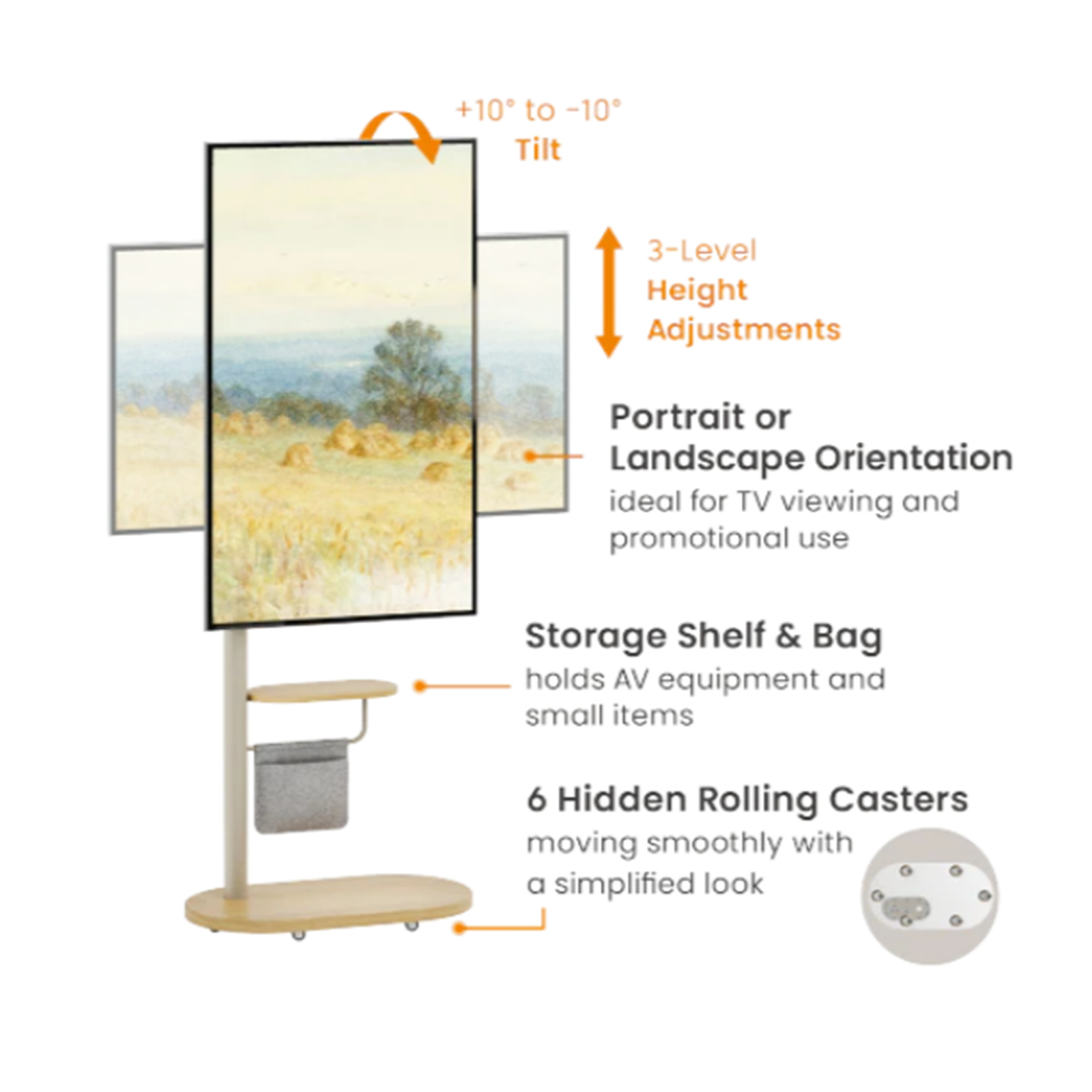A versatile solution for presenting digital displays with ease and elegance. Combining functionality and aesthetics, this stand features a sturdy base for stability and smooth-rolling casters for effortless mobility, allowing for easy display movement. Portrait or landscape orientation ideal for TV viewing and promotional use. Integrated cable management keeps cables hidden and organized. Storage shelf & bag holds AV equipment and small items. Perfect for homes, offices, schools, and retail environments.