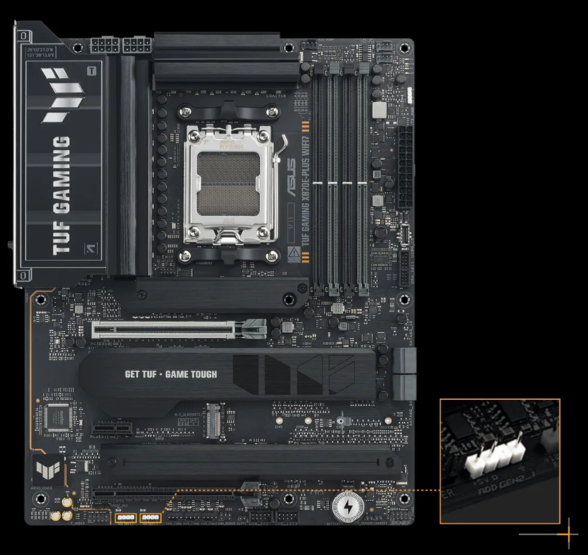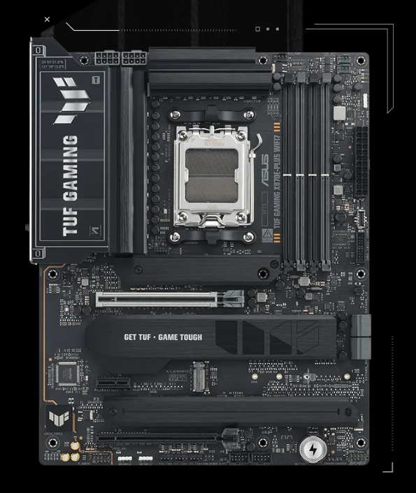 ASUS TUF GAMING X870E-PLUS WIFI7 takes all the essential elements of the latest AMD Ryzen™ processors and combines them with game-ready features and proven durability. Engineered with military-grade components, an upgraded power solution and a comprehensive cooling system, this motherboard goes beyond expectations with rock-solid and stable performance for marathon gaming. TUF GAMING motherboards also undergo rigorous endurance testing to ensure that they can handle conditions where others may fail. This platform delivers the power and connectivity that advanced AI PC applications demand.