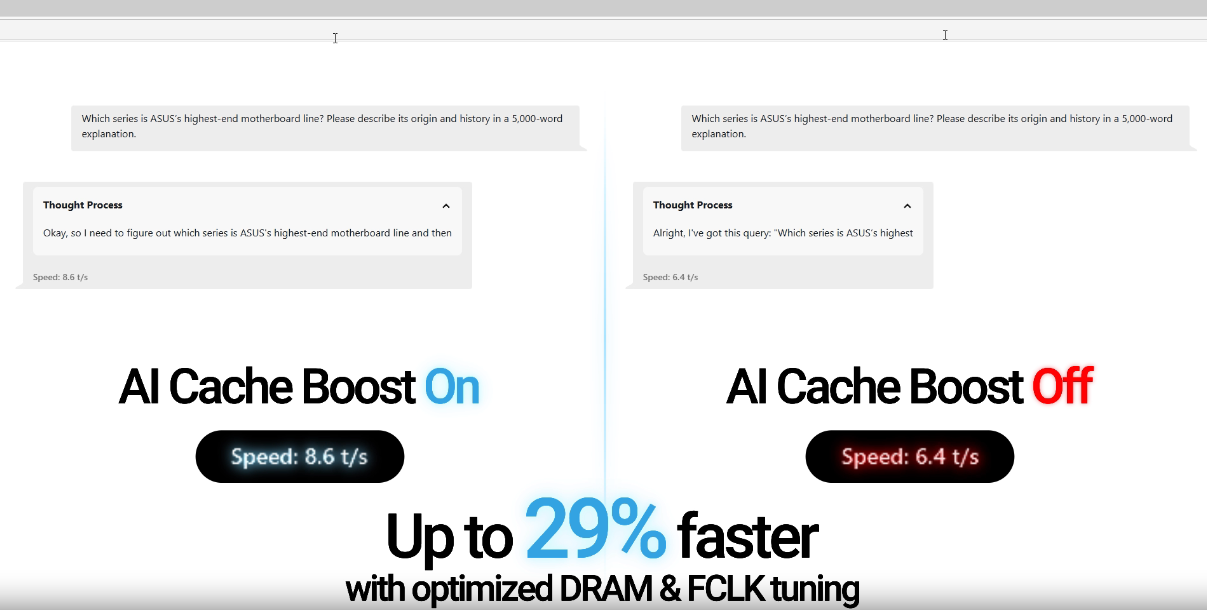 Supercharge your large language model (LLM) workflows with AI Cache Boost. Exclusive to ASUS AMD 800 and 600 series motherboards that use Ryzen™ 9000 Series CPUs, this BIOS setting optimizes CPU cache and memory pathways to deliver up to 29% faster local LLM performance with high-speed memory tuning.