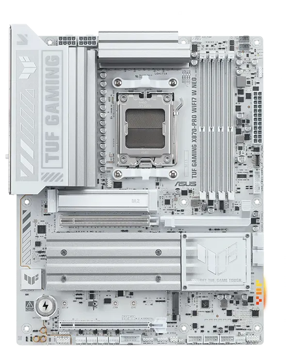 ASUS TUF GAMING X870-PRO WIFI7 W NEO takes all the essential elements of the latest AMD Ryzen™ processors and combines them with game-ready features and proven durability. Engineered with an upgraded power solution and a comprehensive cooling system, this motherboard goes beyond expectations with rock-solid and stable performance for marathon gaming. TUF GAMING motherboards also undergo rigorous endurance testing to ensure that they can handle conditions where others may fail. This platform delivers the power and connectivity that advanced AI PC applications demand.
