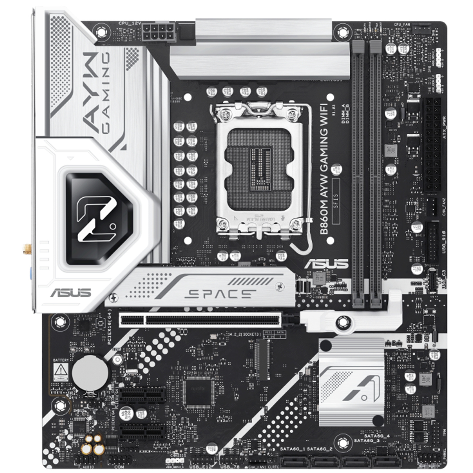 ASUS B860M AYW GAMING WIFI MATX Motherboard Support Intel 15 Gen CPU, Socket 1851. B860 Chipset, 2x M.2, 2x DDR5, 2x Internal USB 2.0 Header, 1x Internal USB 3.2 Header, 1x Internal Type C Header, Wifi 6 + BT