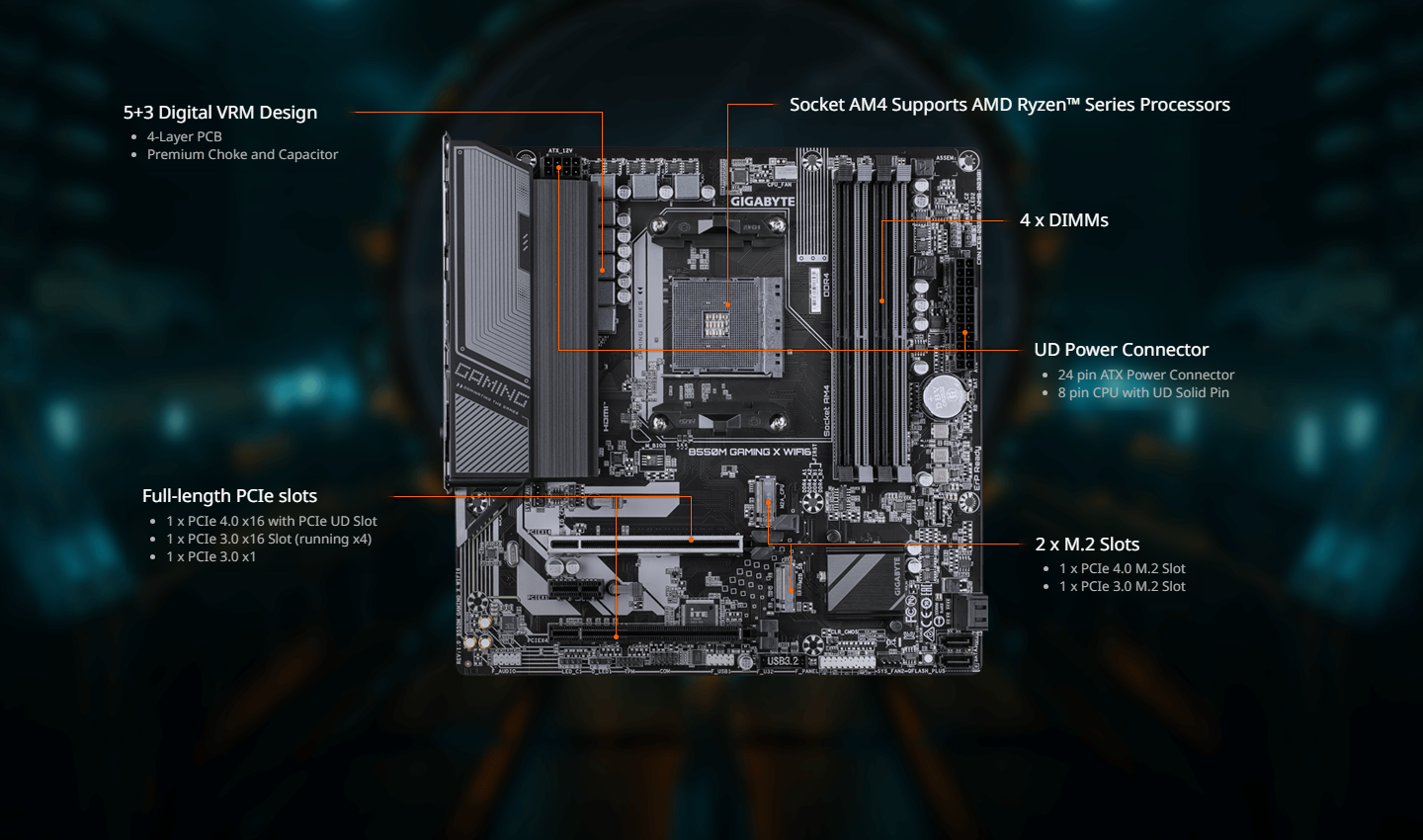 - PCIe UD Slot : PCIe 4.0 x16 slots with 10X strength for graphics card & Better Heat dissipation effect