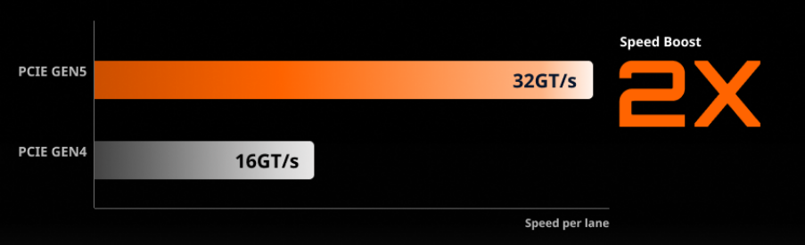 The new GIGABYTE motherboards provides the most efficient solution to enjoy boosted performance of PCIe Gen5 on the existing platform. PCIe 5.0 doubles the data transfer rate of PCIe 4.0 from 16 GT/s to 32 GT/s per lane. This substantial increase in bandwidth particularly benefits high-performance graphics cards, storage devices, and AI accelerators that demand faster data movement.