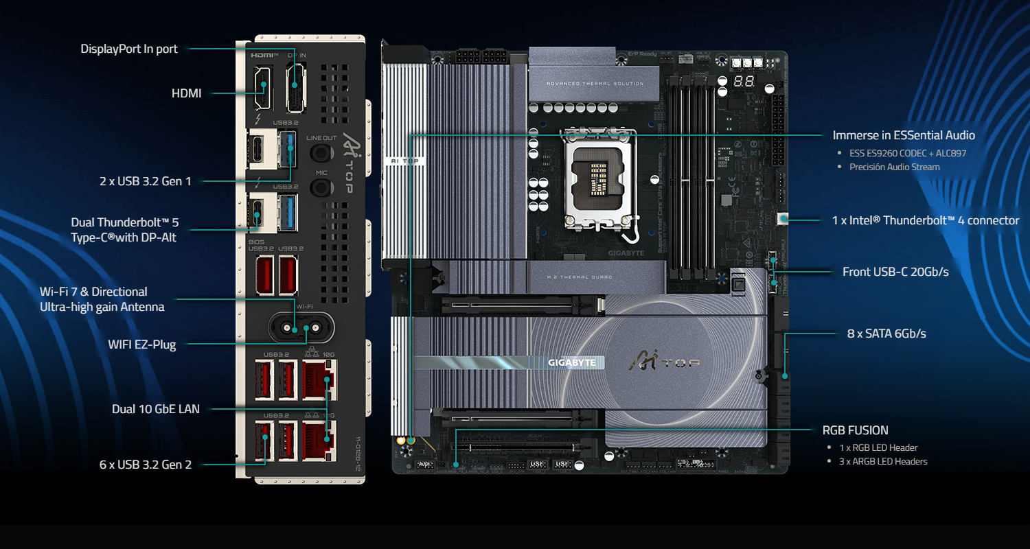 Gigabyte Z890 AI TOP ATX Motherboard For Intel LGA1851 - Z890 Chipset - PCIe 5.0, 4x M.2, 4x DDR5,2 X Thunderbolt 5, Dual 10Gb Lan, WIFI 7 , 2x Internal USB 2.0 Header, 2x Internal USB 3.2 Header, 2x Internal Type C Header
