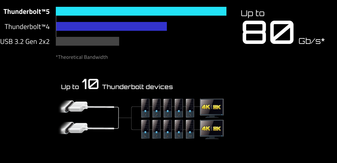 The latest Thunderbolt™ 5 delivers incredible display and data transfer experience for content creators and gamers.