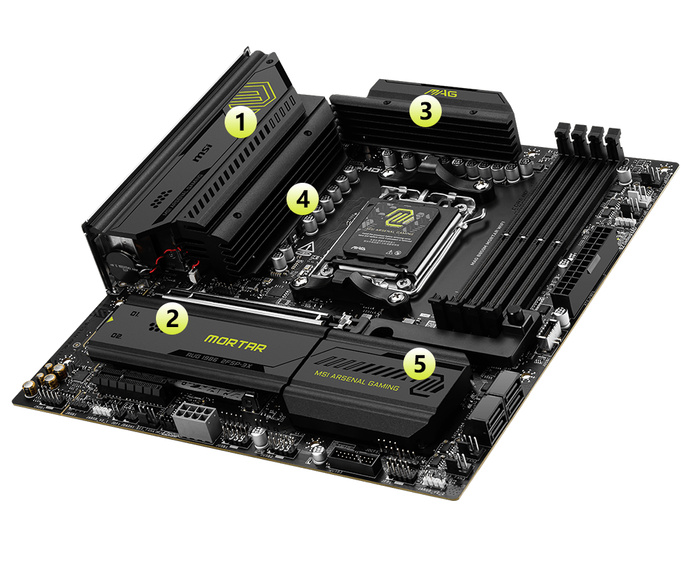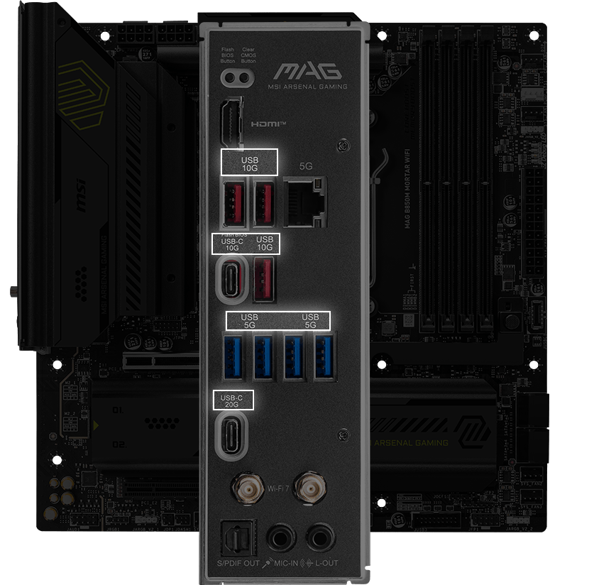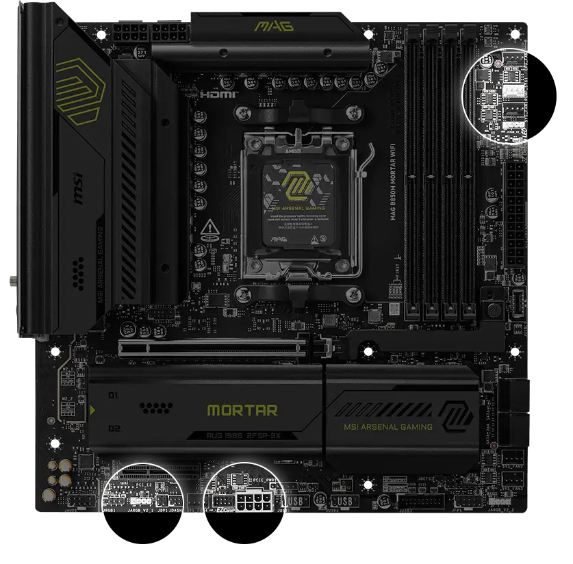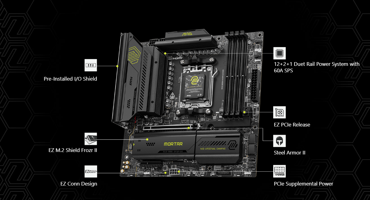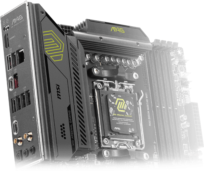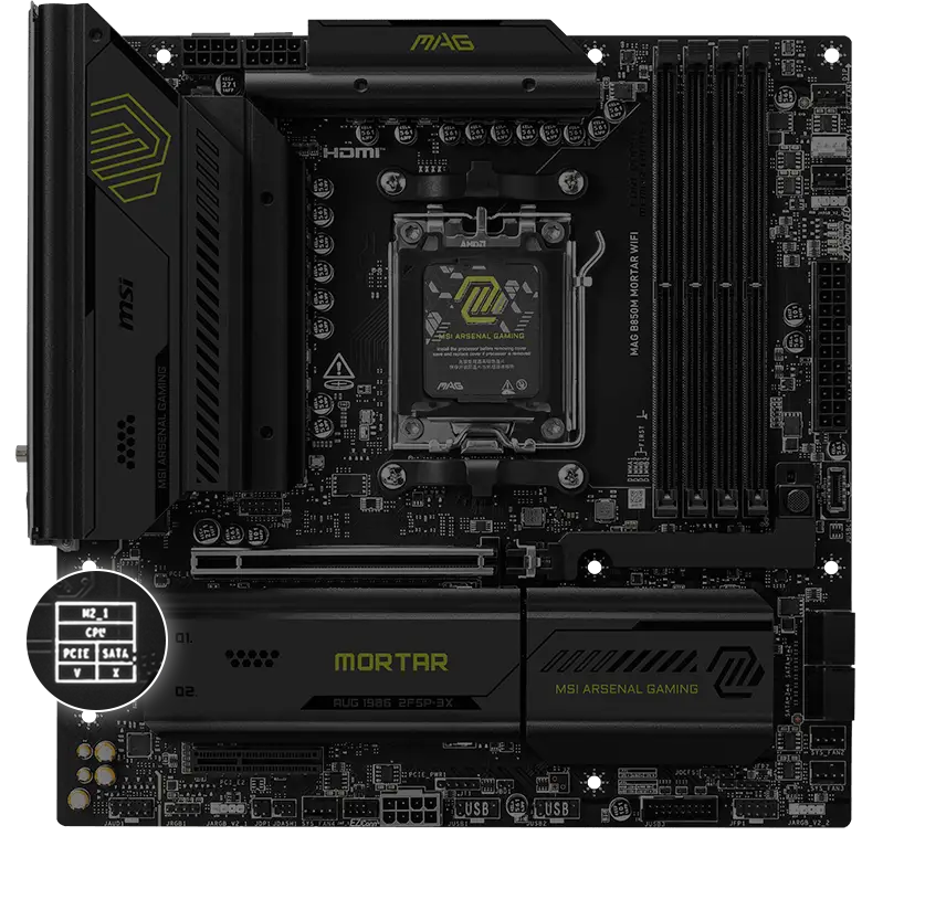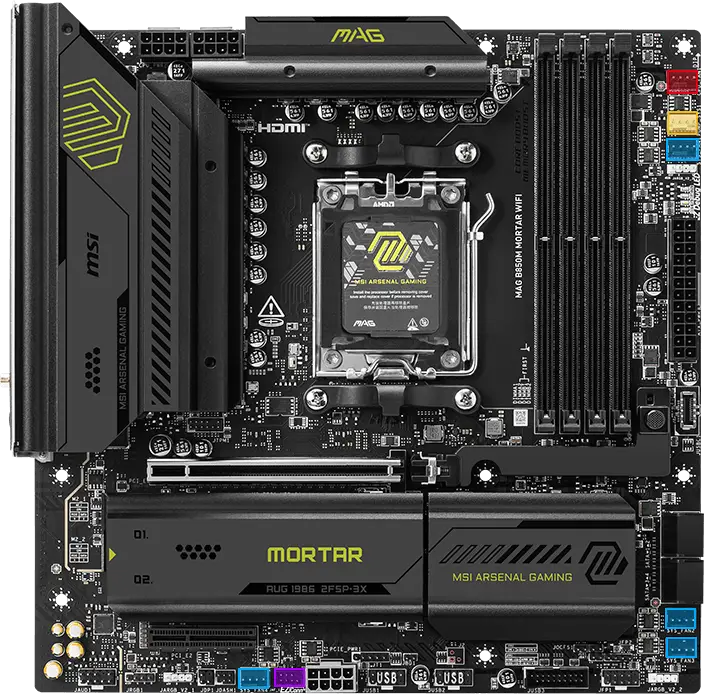 MAG B850M MORTAR WIFI is designed for gamers with a stable, durable and DIY friendly foundation for their PC builds. Coming up with true Wi-Fi 7 solution, 5G LAN, USB 20Gbps, PCIe 5.0 solutions, Supplemental PCIe Power, and exclusive EZ DIY features, it's ready for the battlefield of AMD Ryzen™ 9000 series processors.