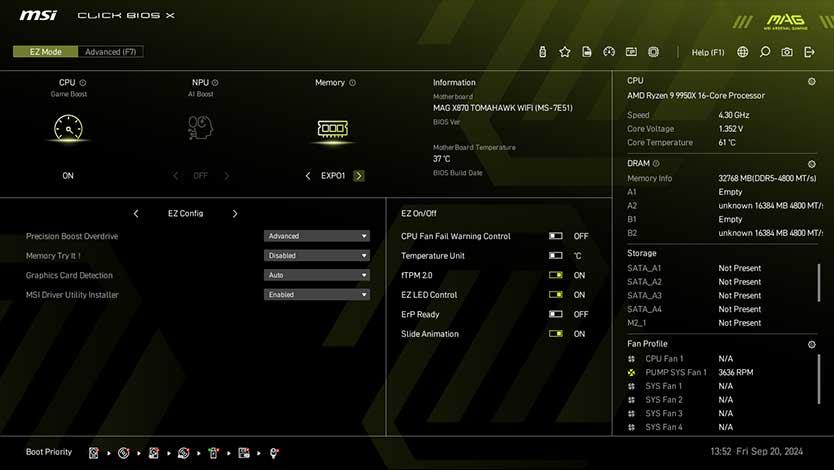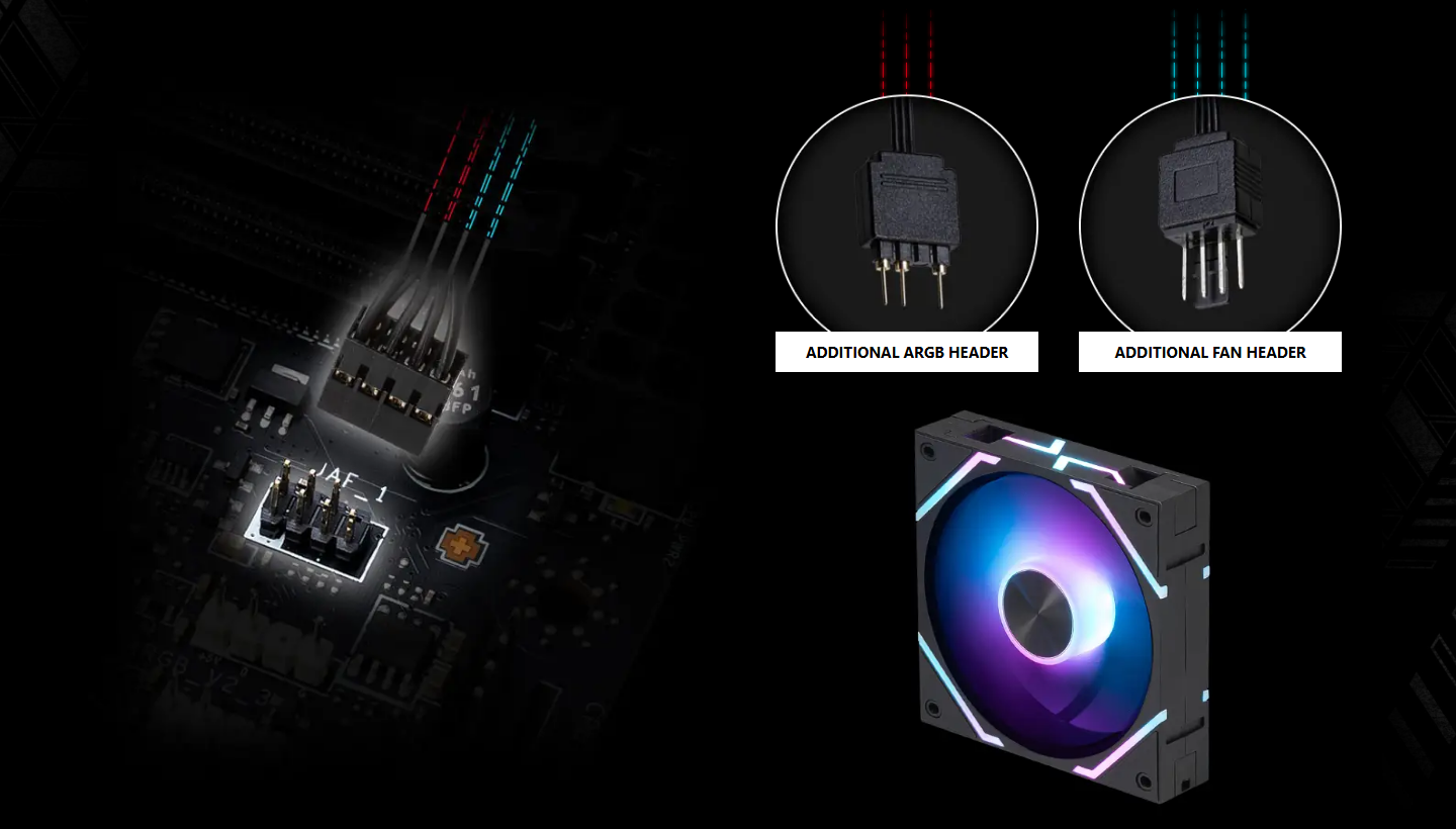The MSI exclusive JAF_1 header allows MPG EZ120 ARGB fan to operate with a single cable. Alternatively, the JAF_1 header can be converted into additional ARGB Gen 1 and fan headers by using a dedicated 1-to-2 EZ Conn-cable, streamlining and optimizing the entire building process.