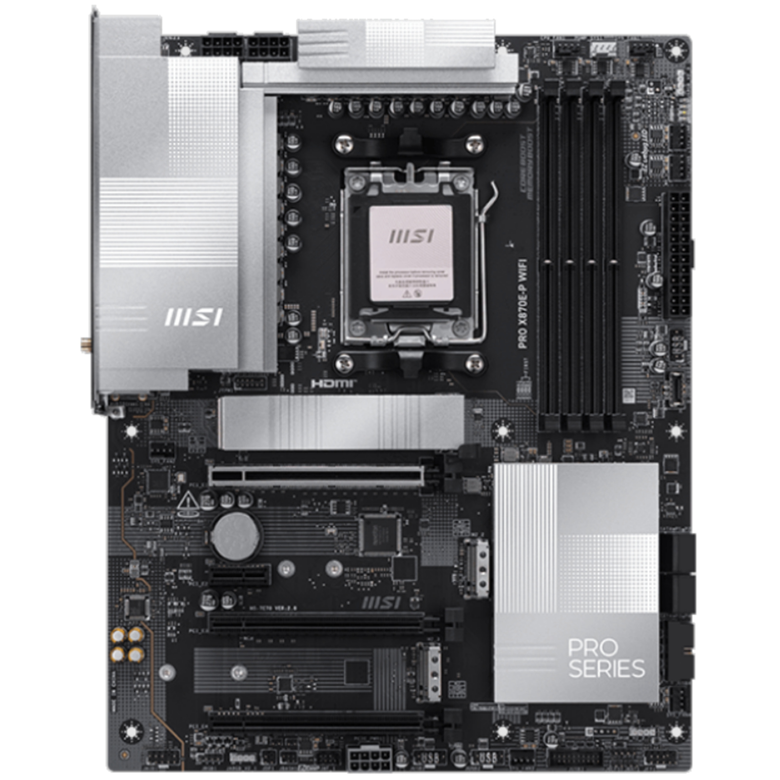 PRO X870E-P WIFI offers a simple design with a harmonious silver color scheme that perfectly matches both white and black PC builds. It is engineered with many exclusive features of MSI, a true Wi-Fi 7 with EZ Antenna, 5G LAN, PCIe 5.0 M.2 with EZ M.2 Shield Frozr II, and Supplemental PCIe Power, ready for the AMD Ryzen™ 9000 series processors.