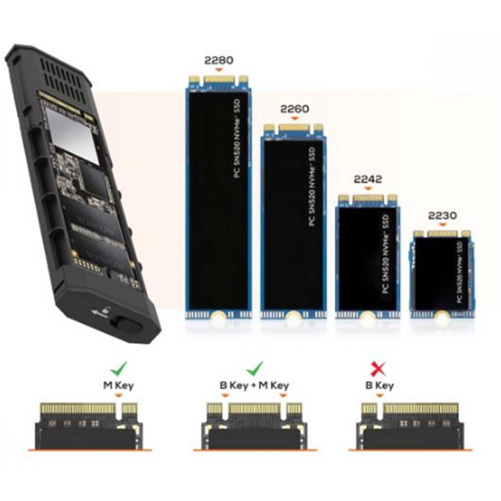 This portable SSD case supports M Key and B+M Key SSD sizes (2230/2242/2260/2280) and enables high-speed data transfer of up to 10Gbps. With dual protocol support for NVMe and SATA SSDs, this USB 3.1 Gen 2 compatible enclosure seamlessly connects to USB-C computers, laptops, and MacBooks for reliable performance.