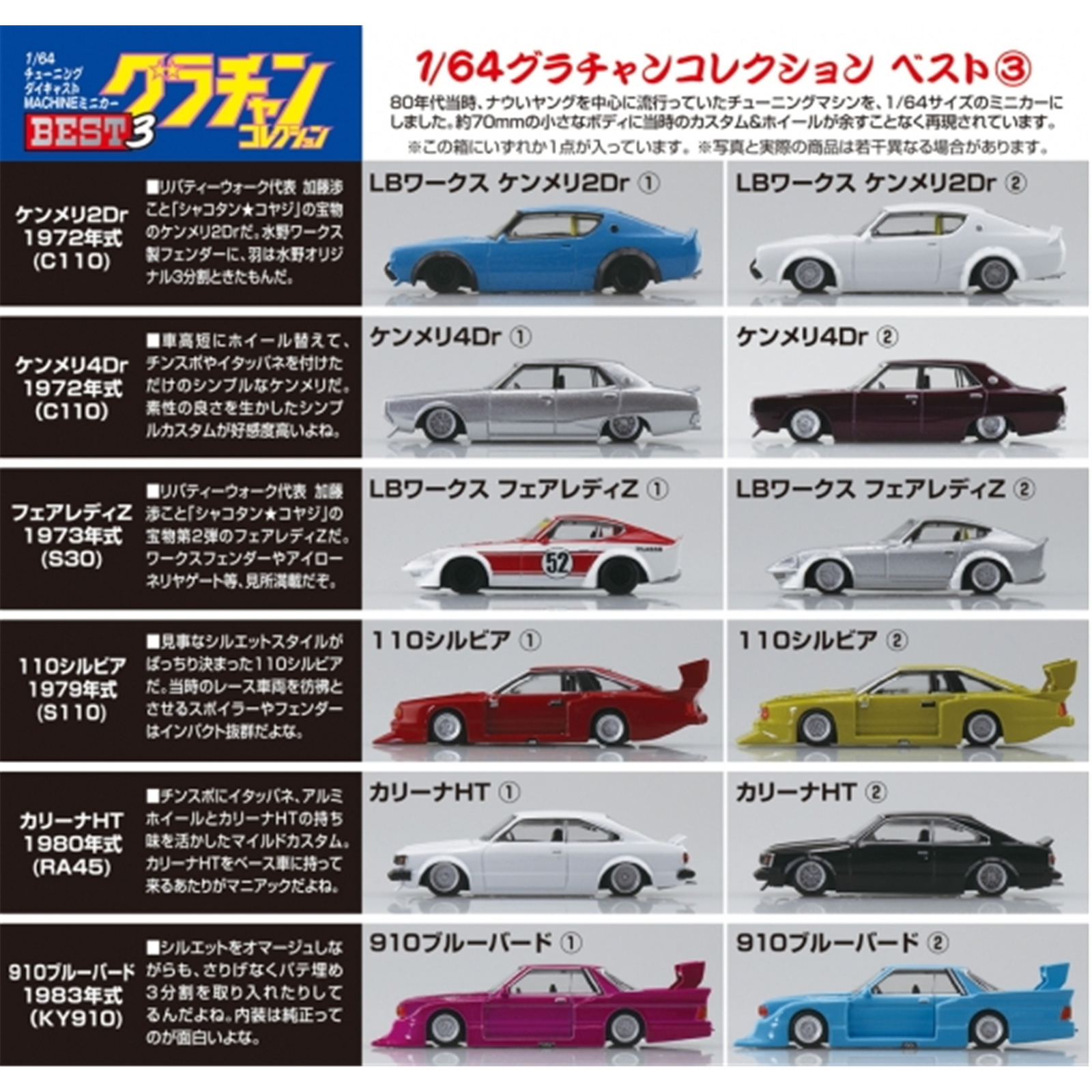 The tuning machines that were popular among the young and trendy in the 80's have been made into 1/64 sized miniature cars. The customization and wheels of the time have been fully reproduced in a small body of about 70mm.